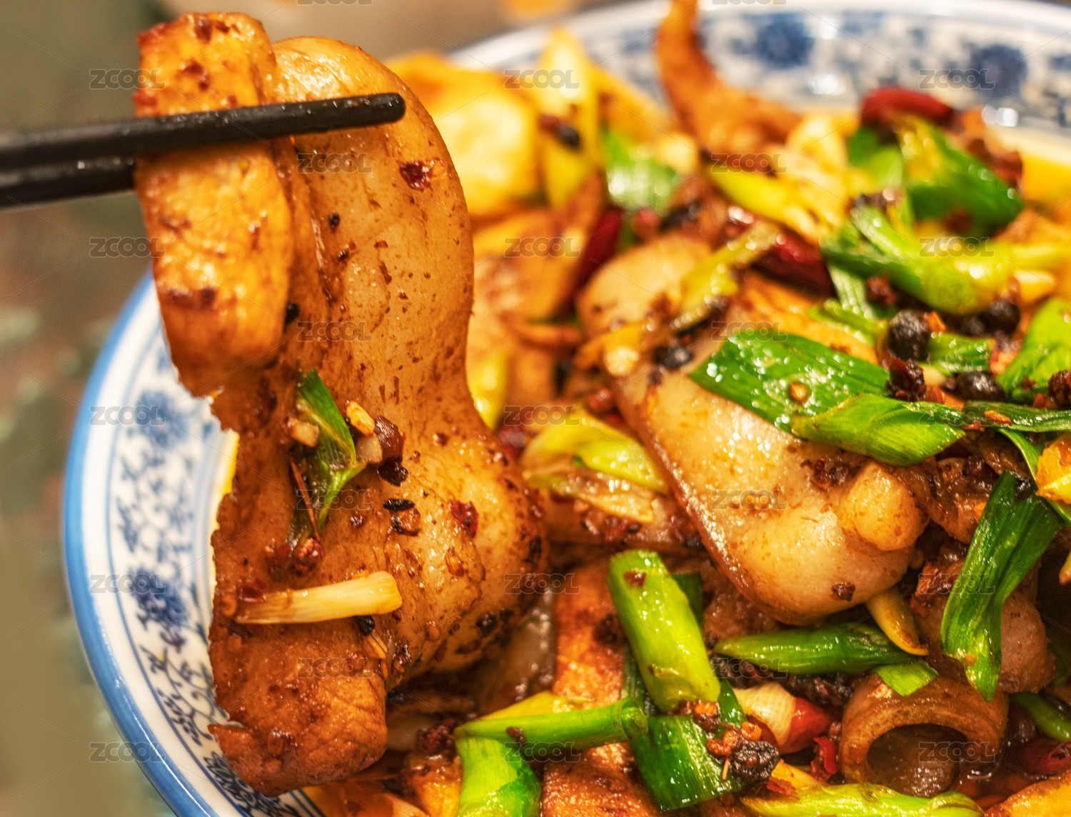 筷子上夹起的中国特色川菜蒜苗回锅肉