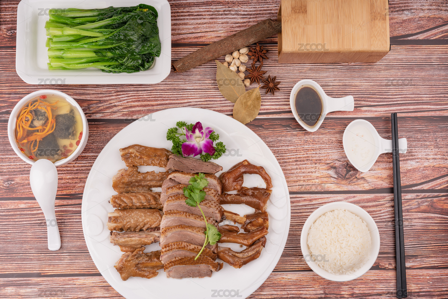 在木质背景下的潮汕卤水拼盘,鹅肉鹅翅膀米饭汤,中餐组合