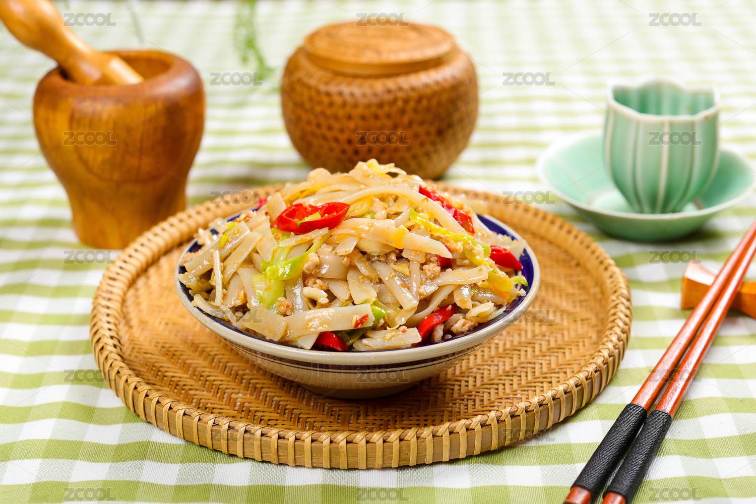 木盒上盘子里筷子夹着的红薯粉炒腊肉