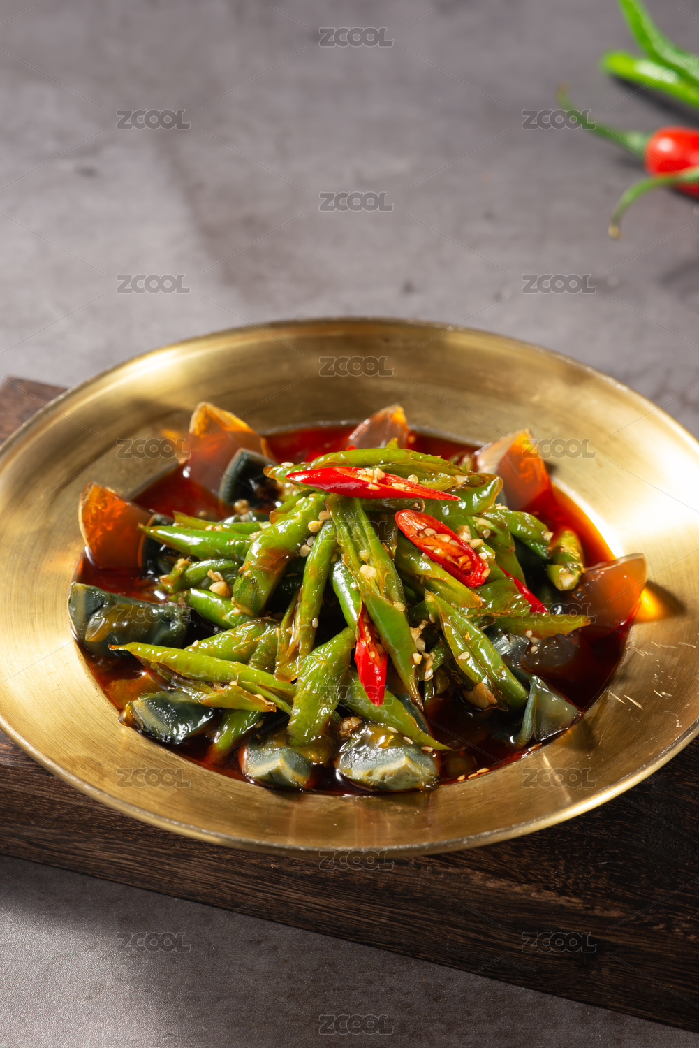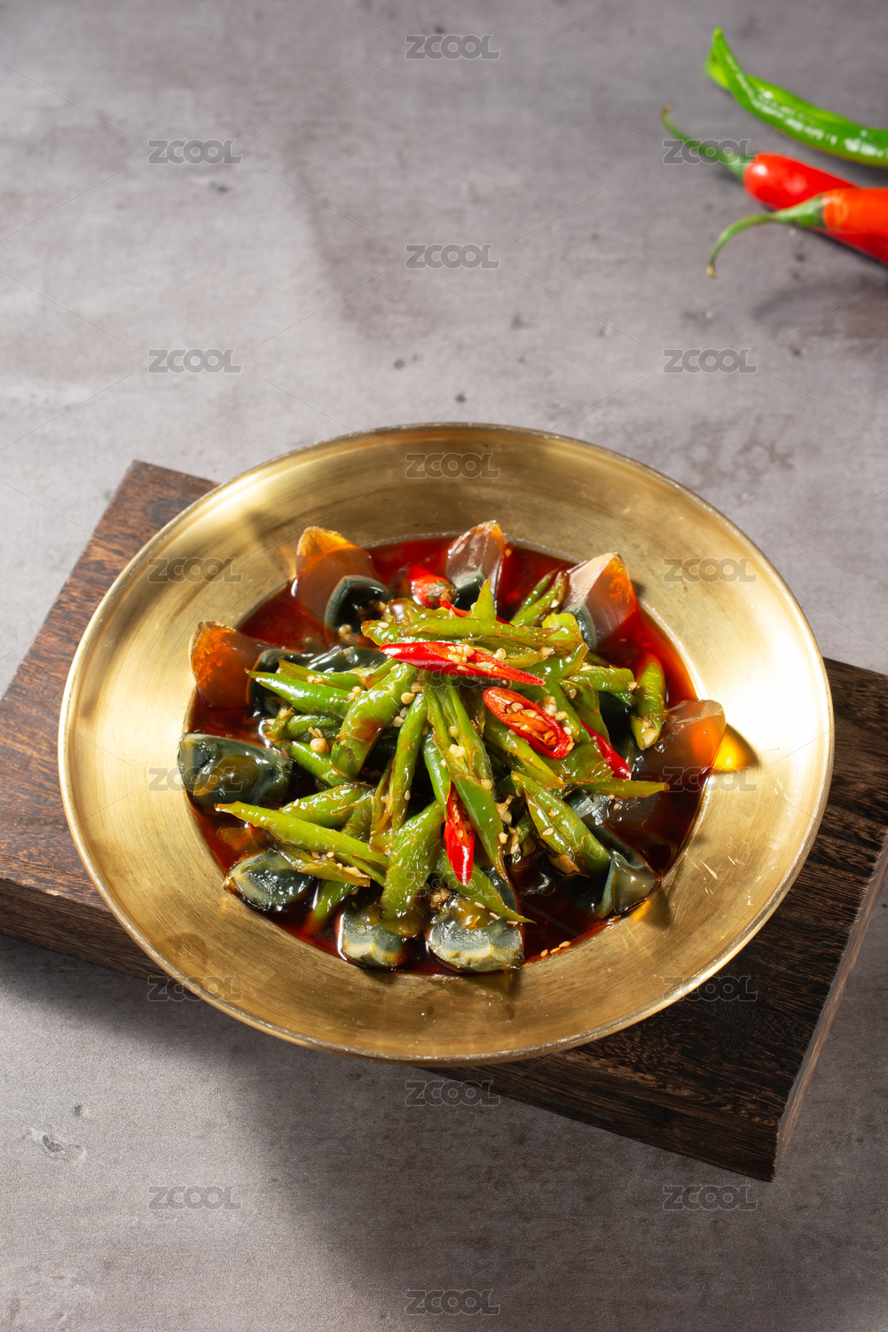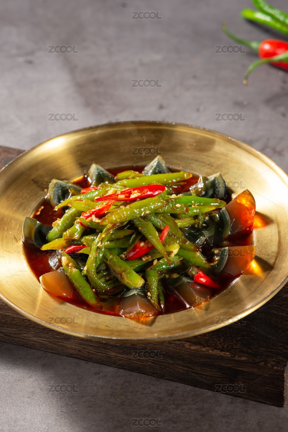 白盘里的菜品青椒皮蛋烧椒皮蛋麻辣皮蛋