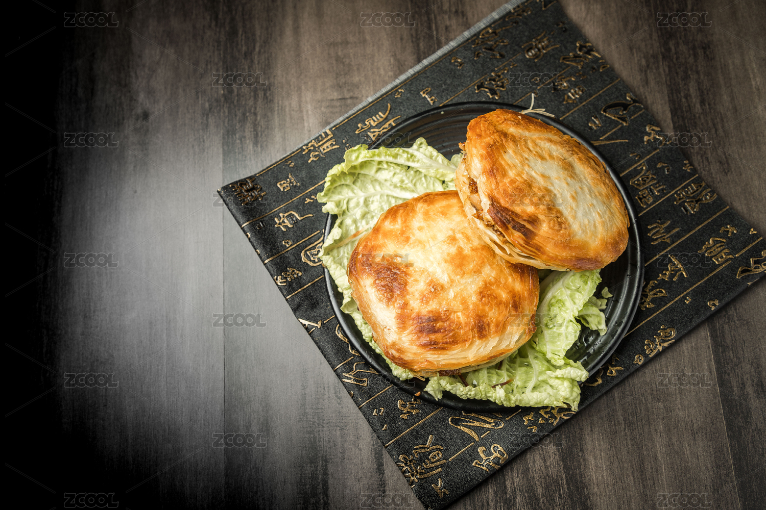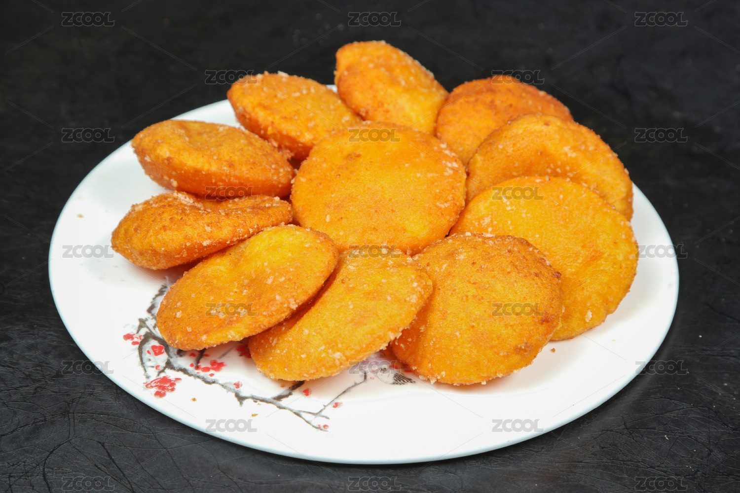 自助餐厅里美味的炸鱼饼盛放在三角形竹篓内
