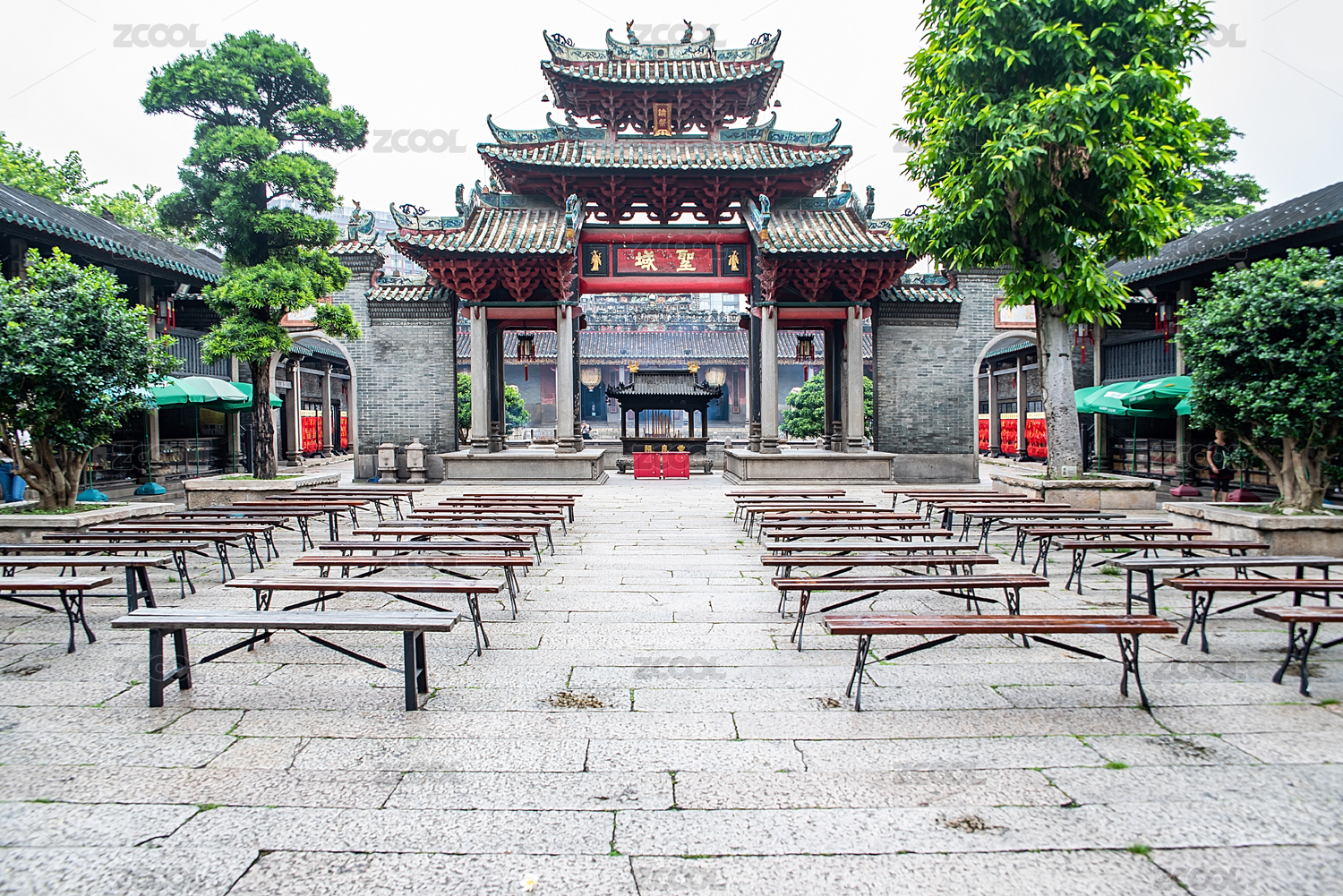 中国广东省佛山祖庙灵应祠牌坊和戏院的空坐位