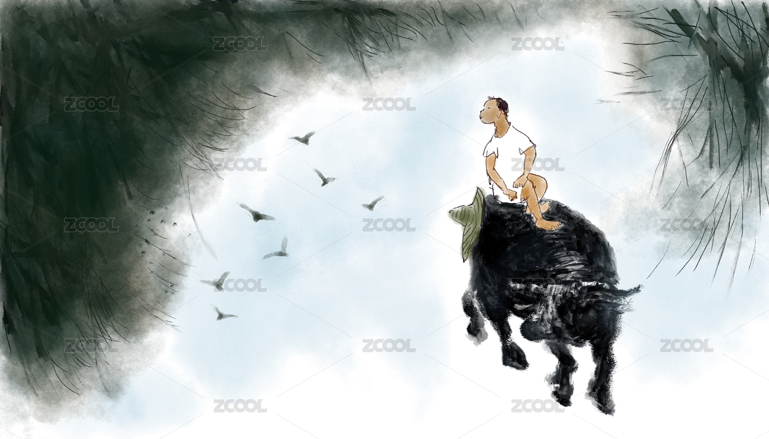 中国插画国画水牛人物画意境画