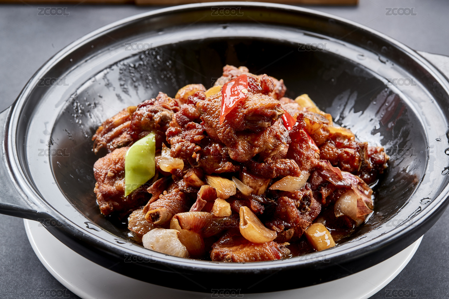 黑色砂锅装的红烧柴鸡煲(红焖鸡块)