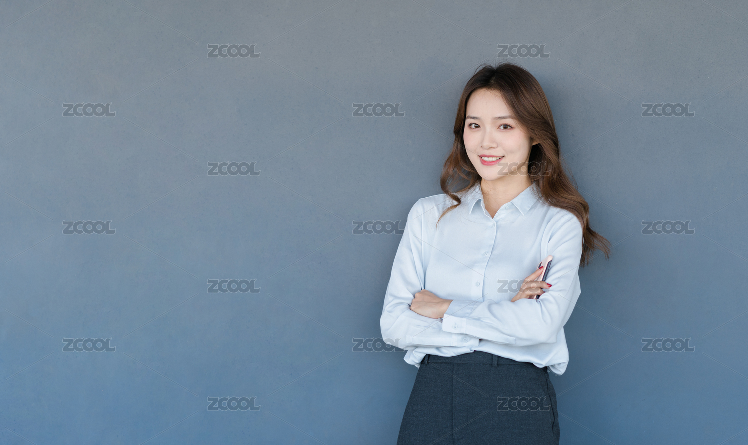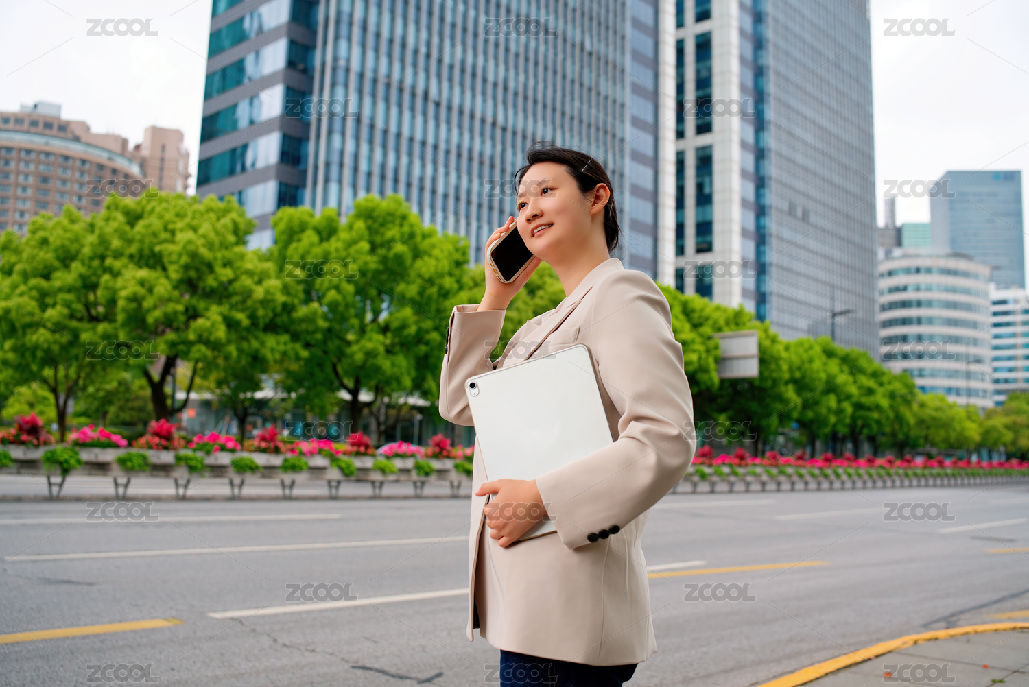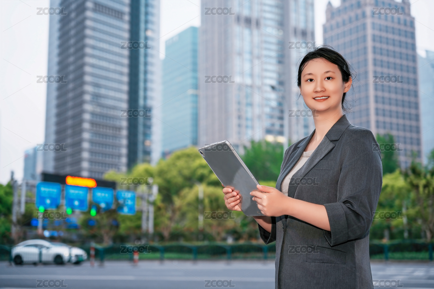 充满自信的亚裔女人站在高楼大厦前面带微笑
