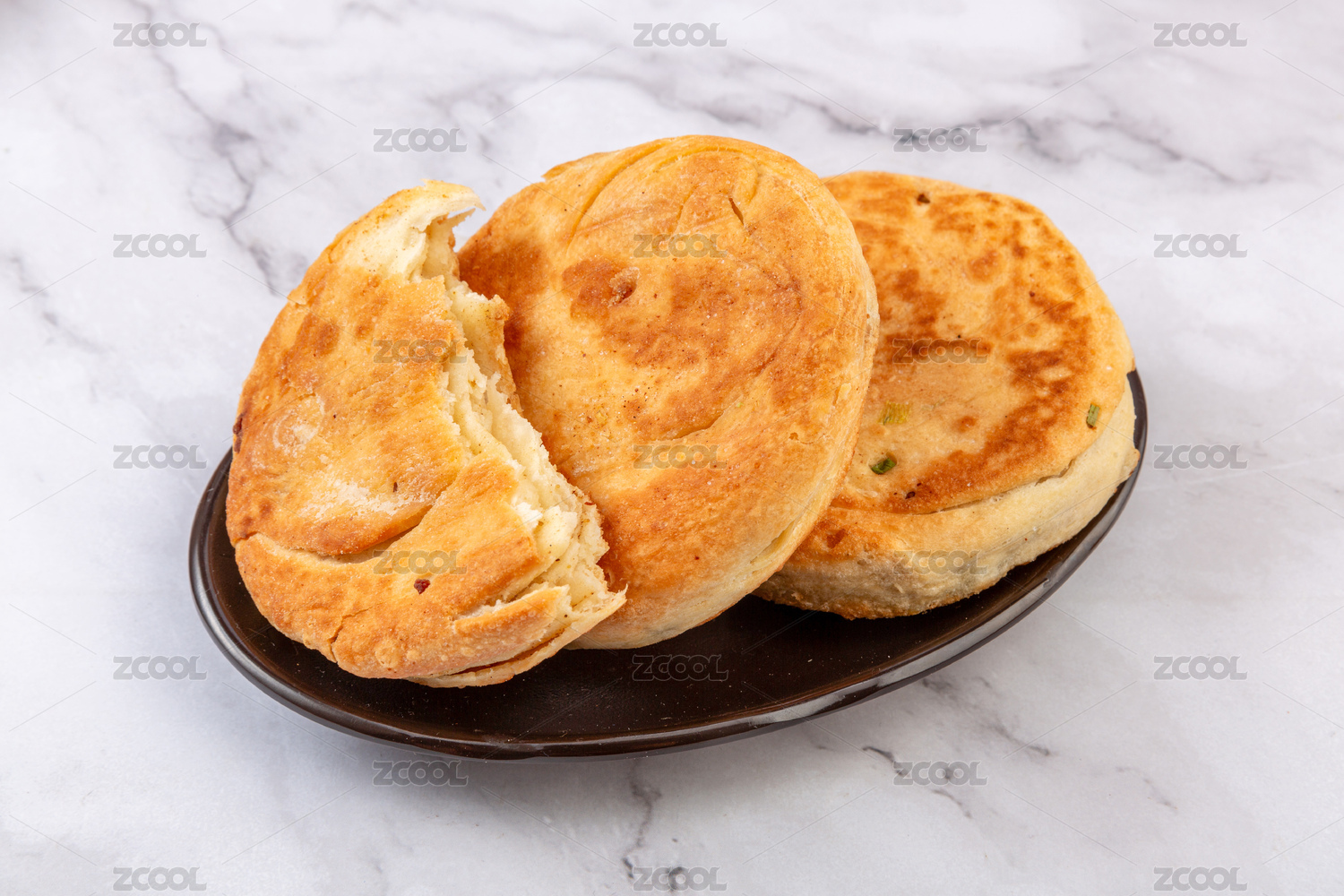 浅色背景上餐具上摆放的五香芝麻烧饼