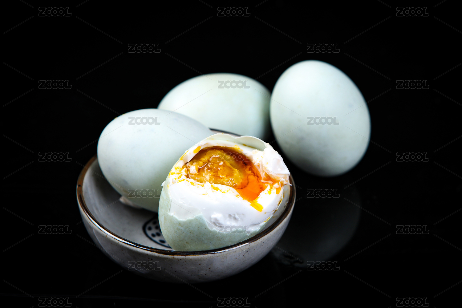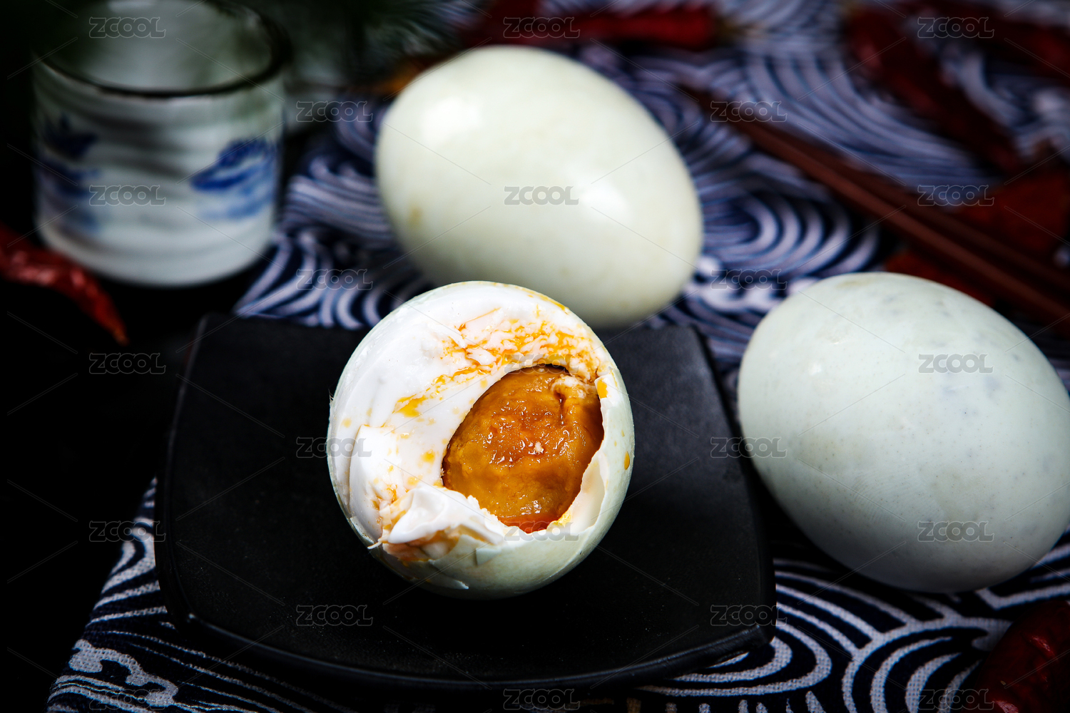 黑底上放着两个完整的海鸭蛋和一个流油鸭蛋