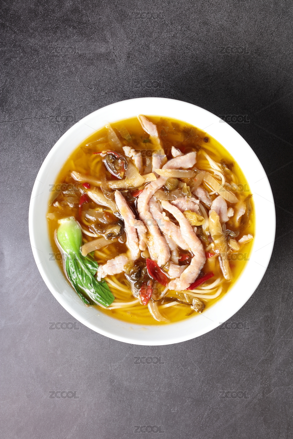 大碗里的泡椒酸菜肉丝面条
