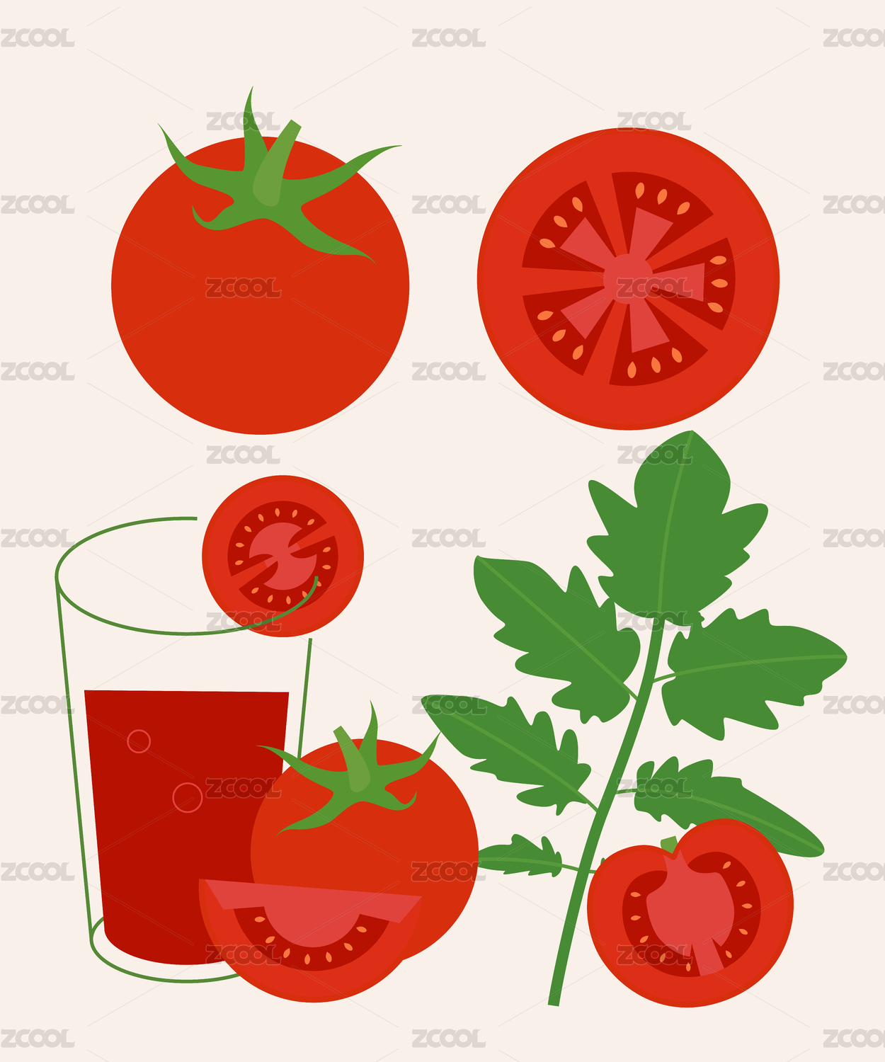 西红柿番茄带叶子及切开打成果汁扁平插画