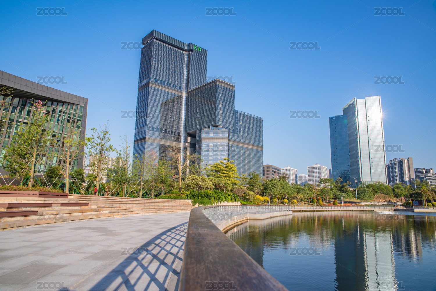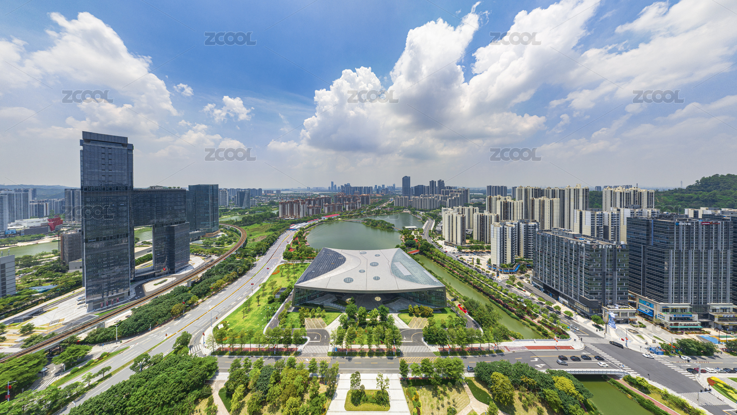 航拍广州黄埔中新知识城地表建筑凤凰湖公园