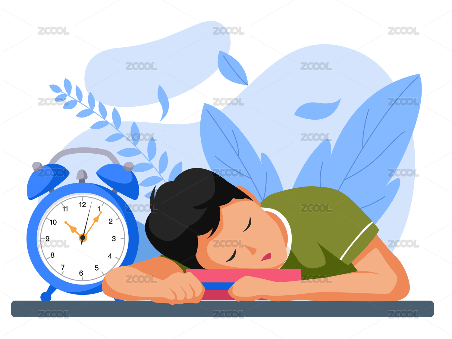 男学生抱着书在桌上睡觉旁边有闹钟矢量插画