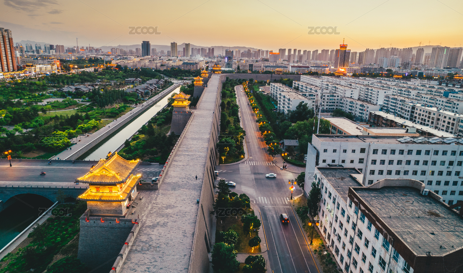 航拍傍晚时分的大同古城墙