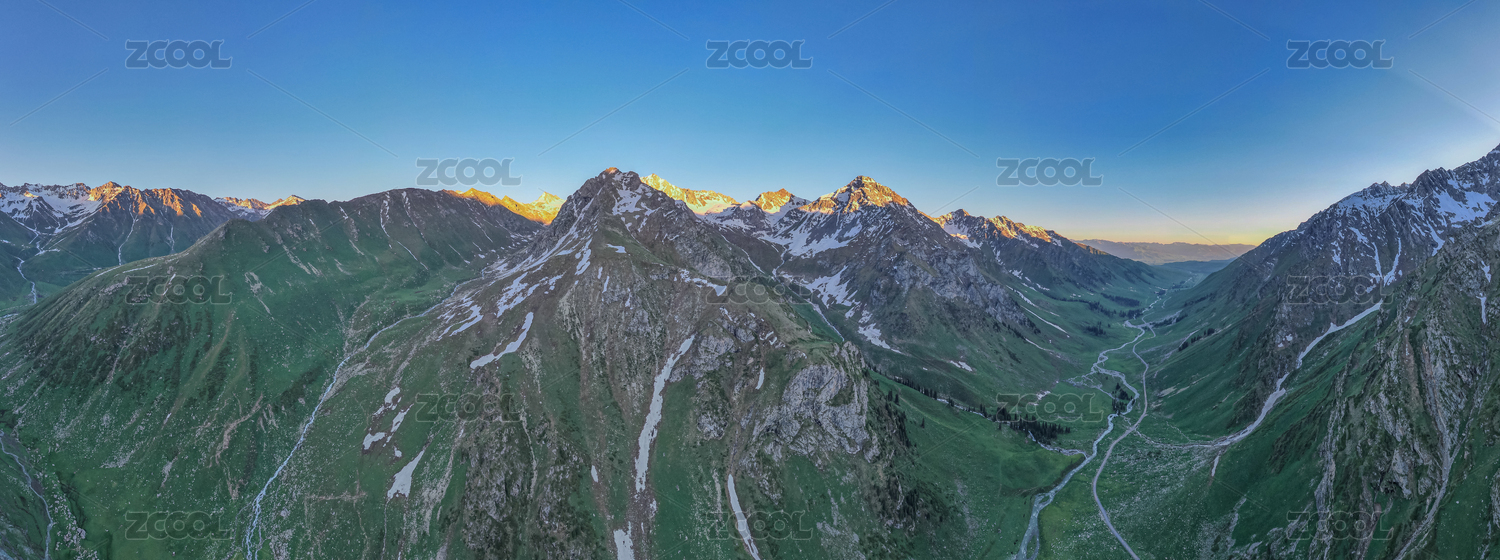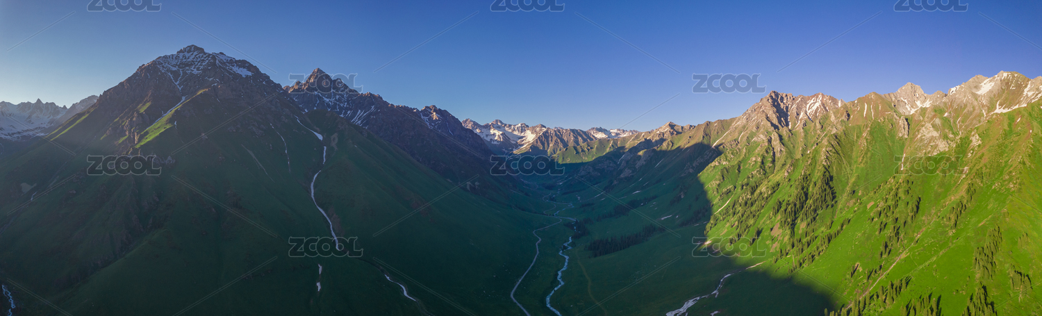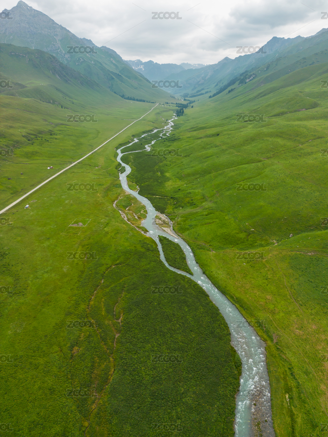 中国新疆伊犁孟克特古道溪流雪山航拍风光