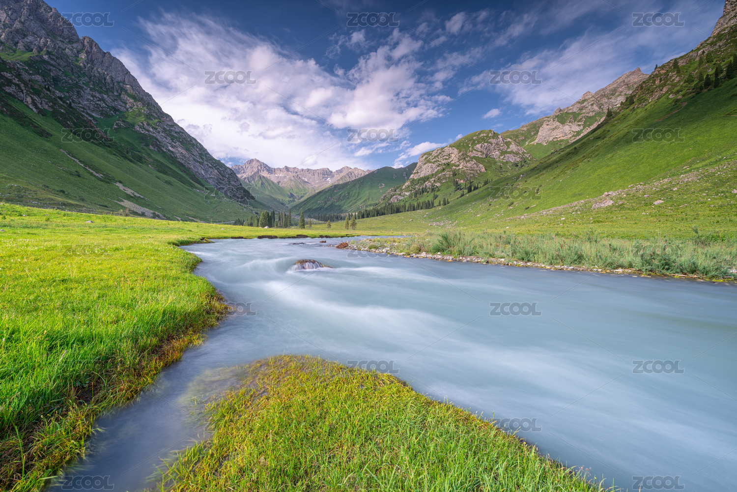 中国新疆伊犁孟克特古道蓝天白云溪流风光