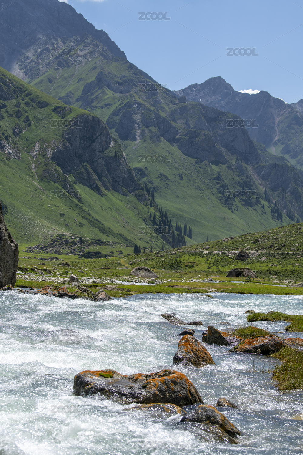 中国新疆伊犁孟克特古道溪流雪山自然风光