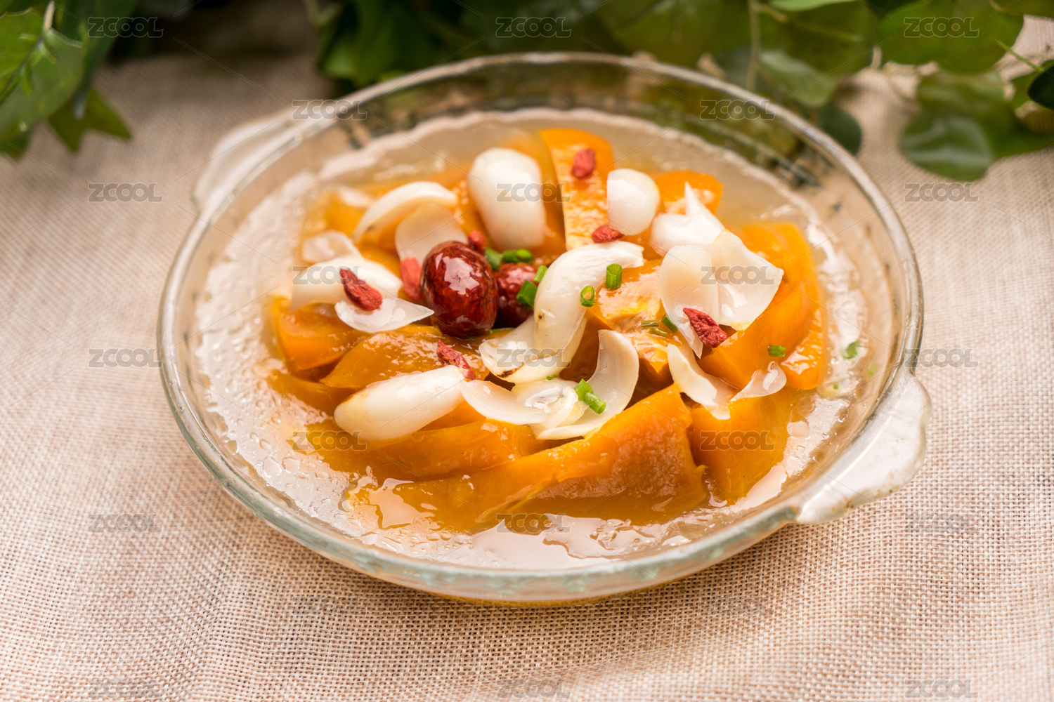 养生菜品百合枸杞蒸南瓜盛放在透明玻璃盘中
