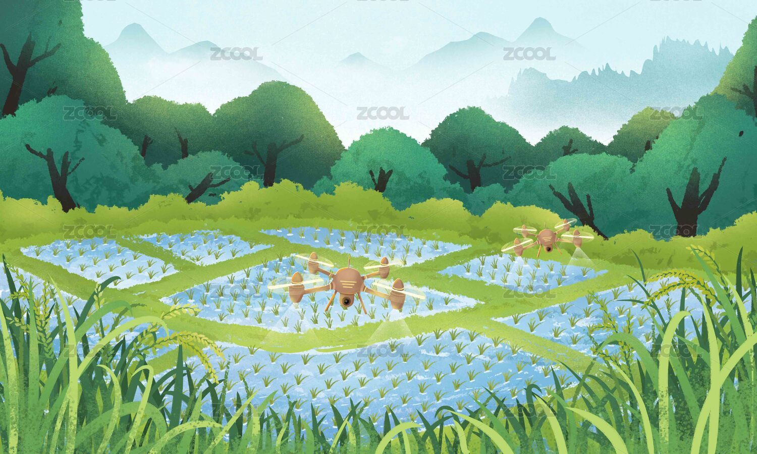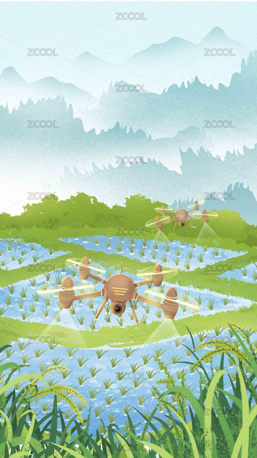 中国风科技农业下在绿色农田喷撒农药的无人