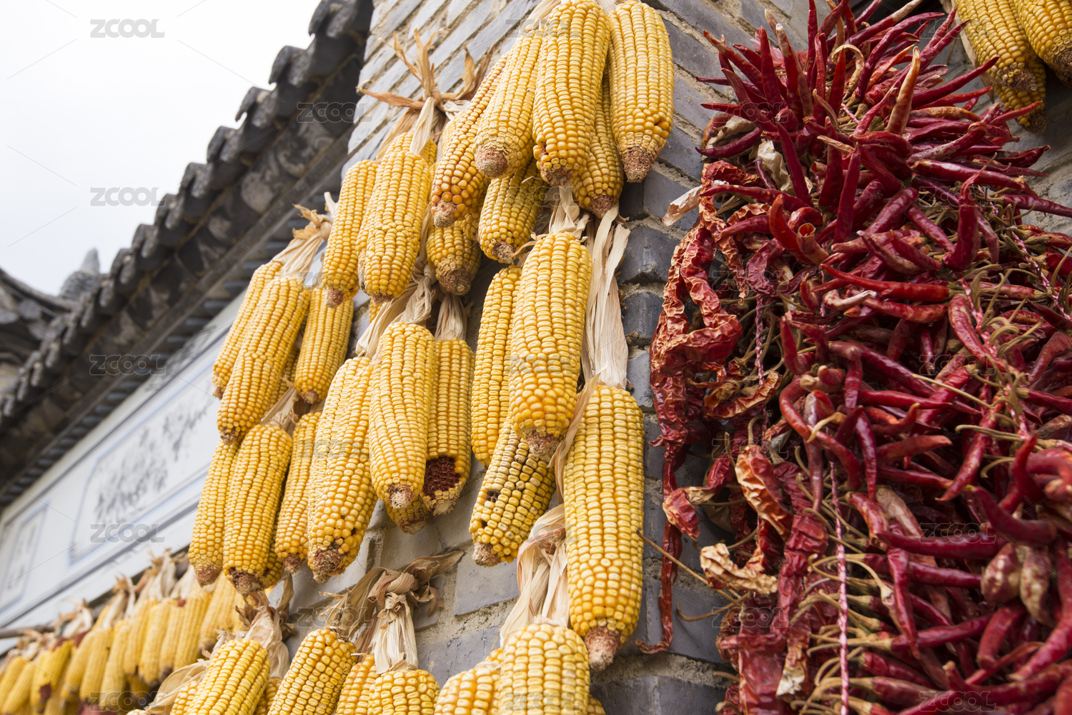 云南建水团山村里挂在墙上的一排晒干的莲蓬