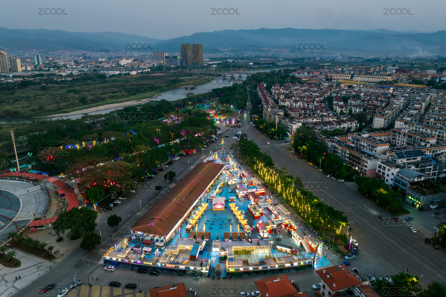 云南瑞丽市航拍瑞丽江星光夜市城市风光