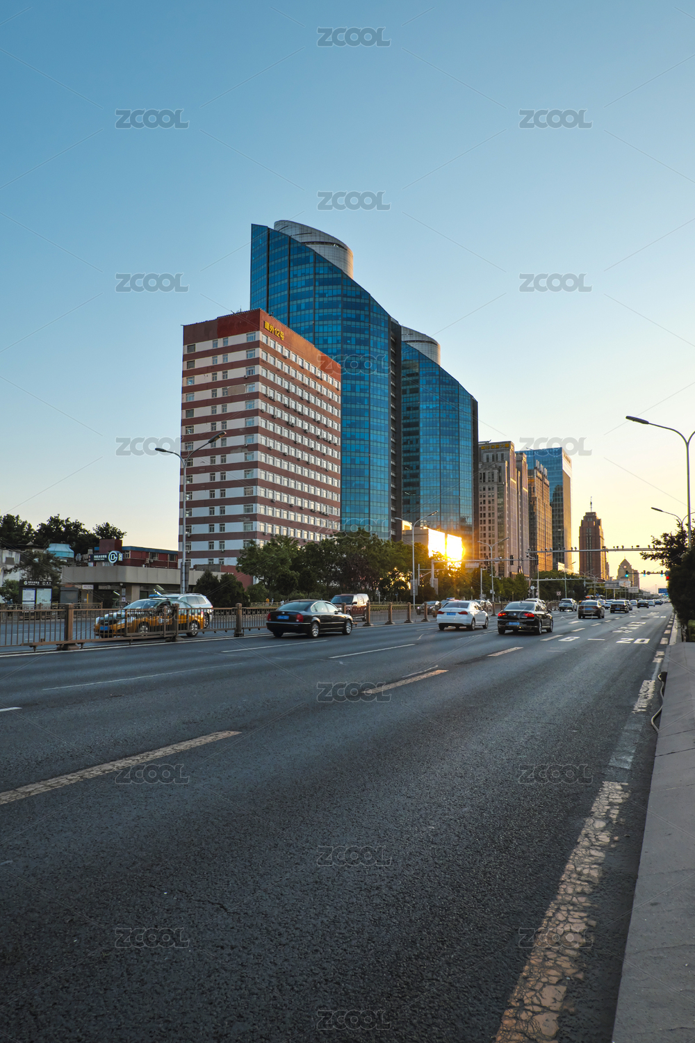 黄昏夕阳下的北京城市街道交通