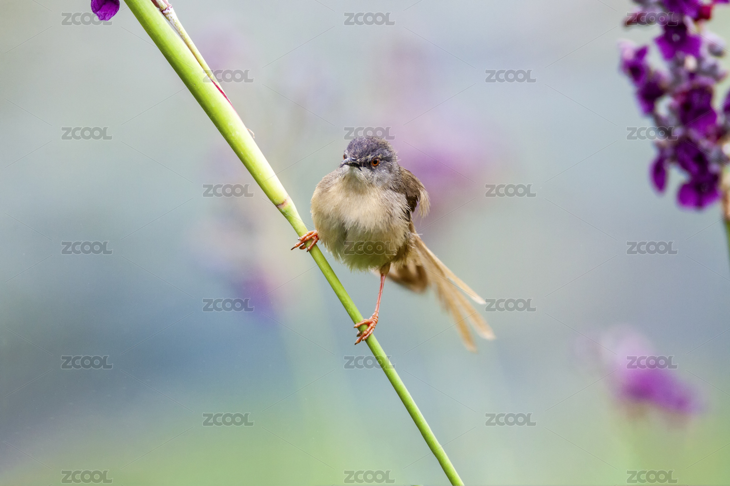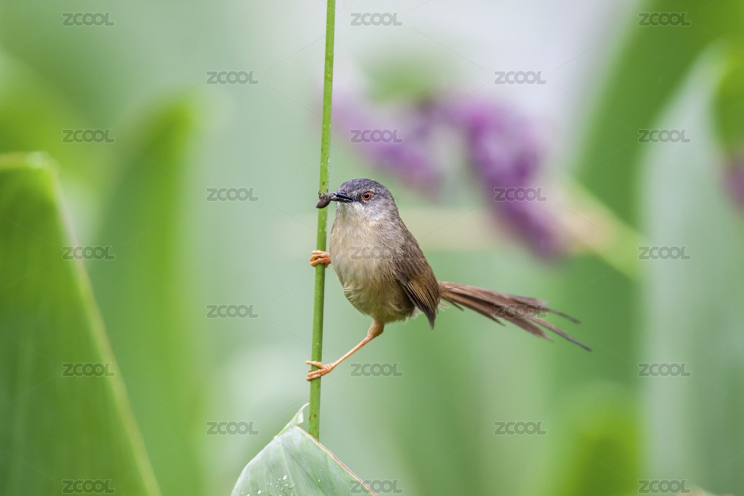 一只藏匿于芦苇丛中觅食的黄腹鹪莺鸟