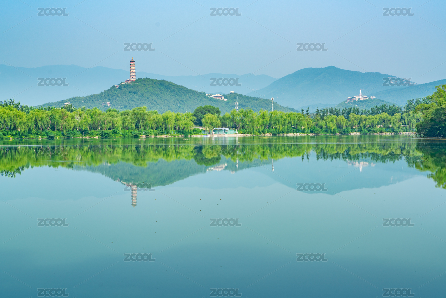 中国北京海淀区颐和园昆明湖及远处的玉泉山玉峰塔