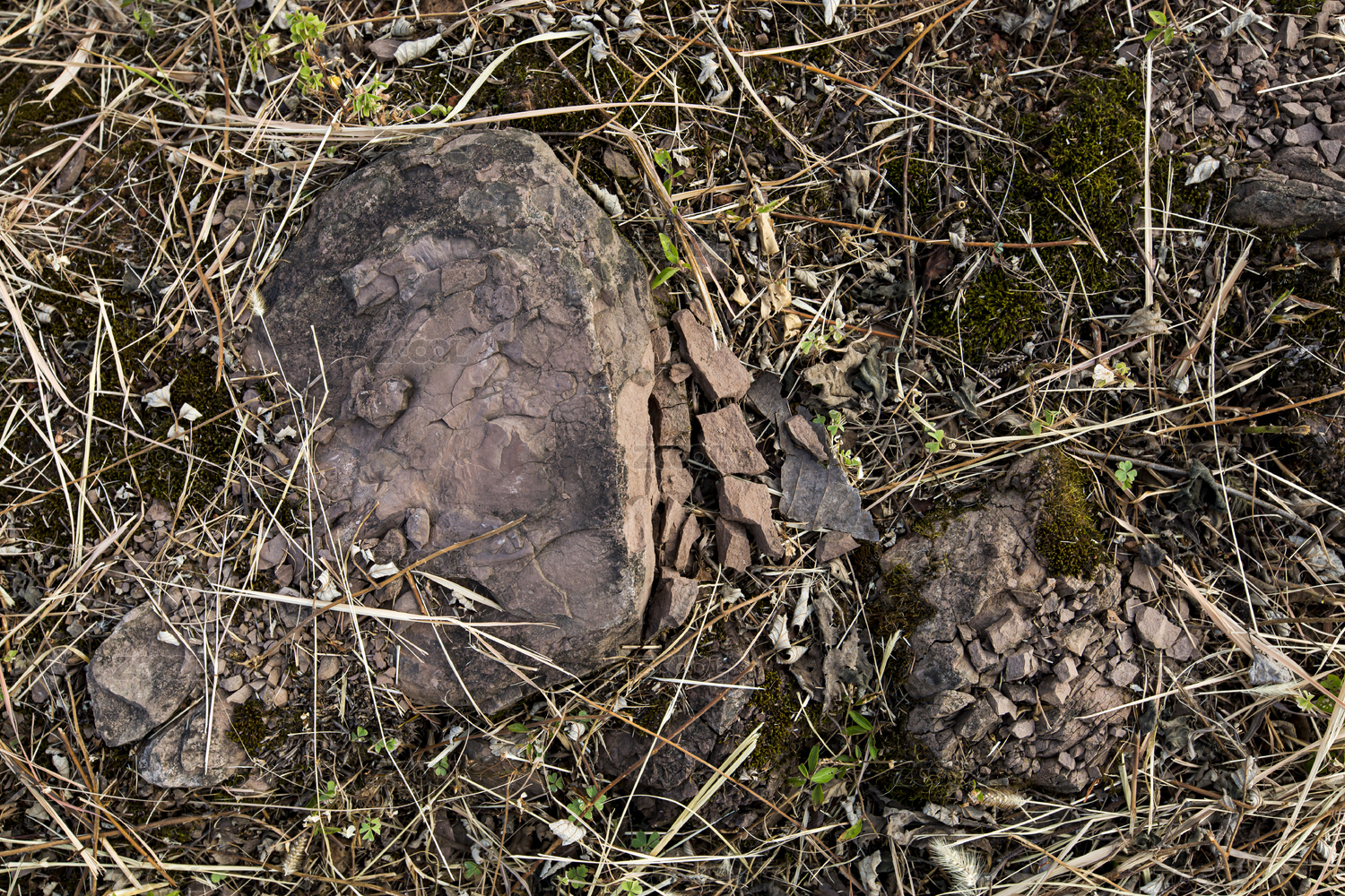 秋天的枯草地面上一块风化的石头