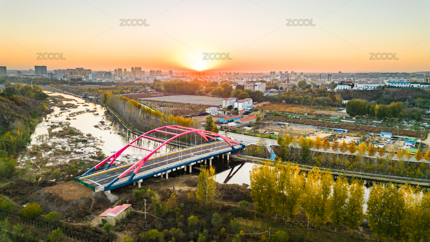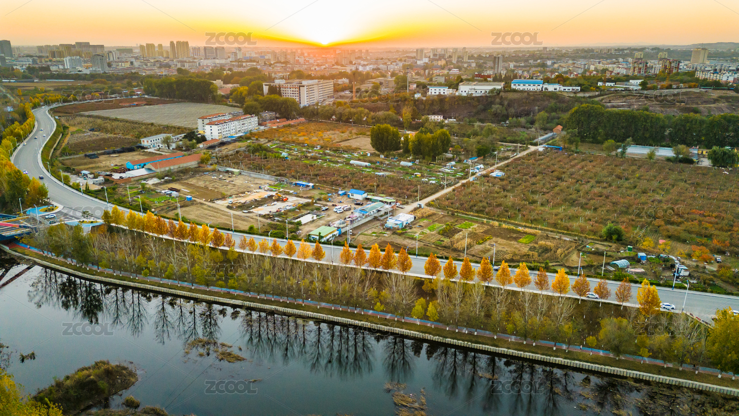 中国山东烟台城市黄昏河畔秋景落日下风光
