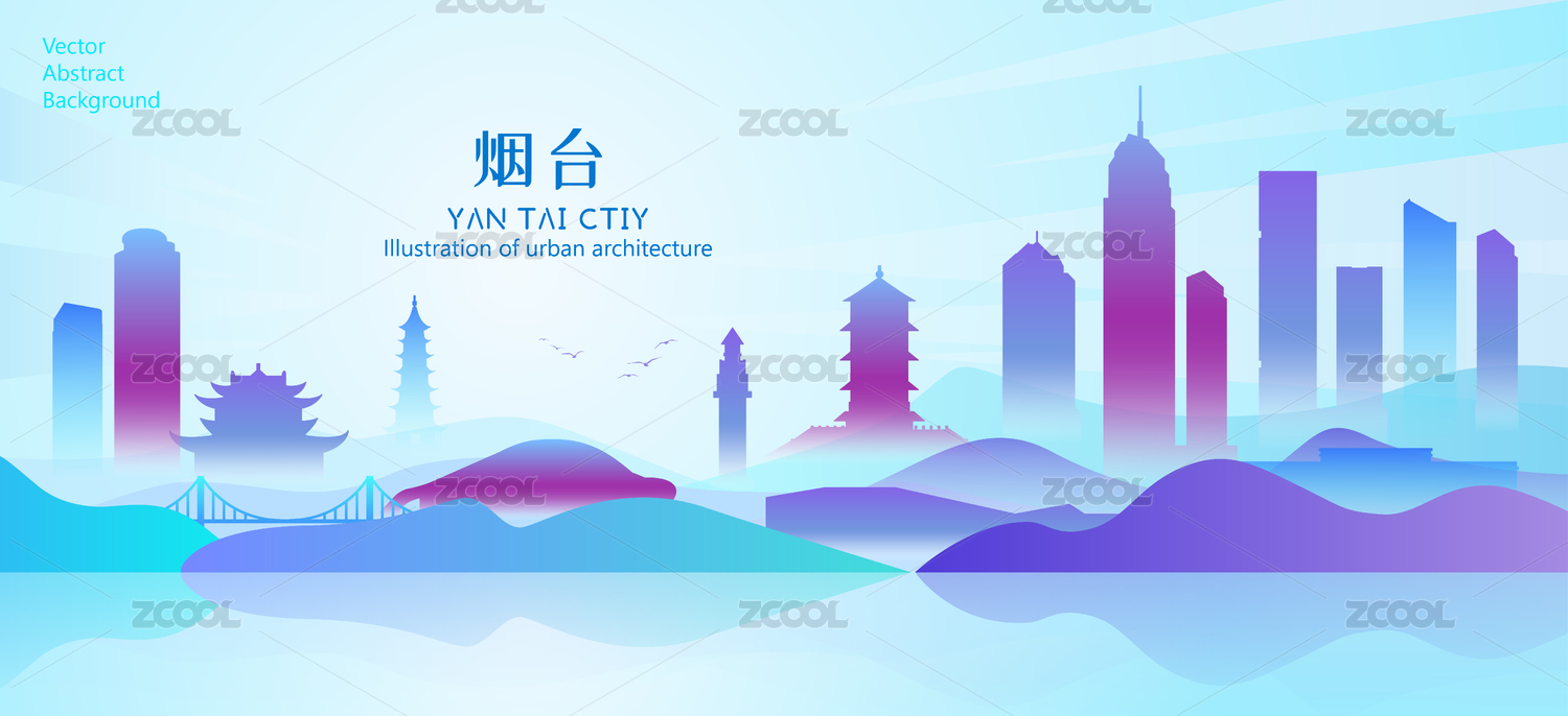多彩烟台城市地标建筑矢量插画