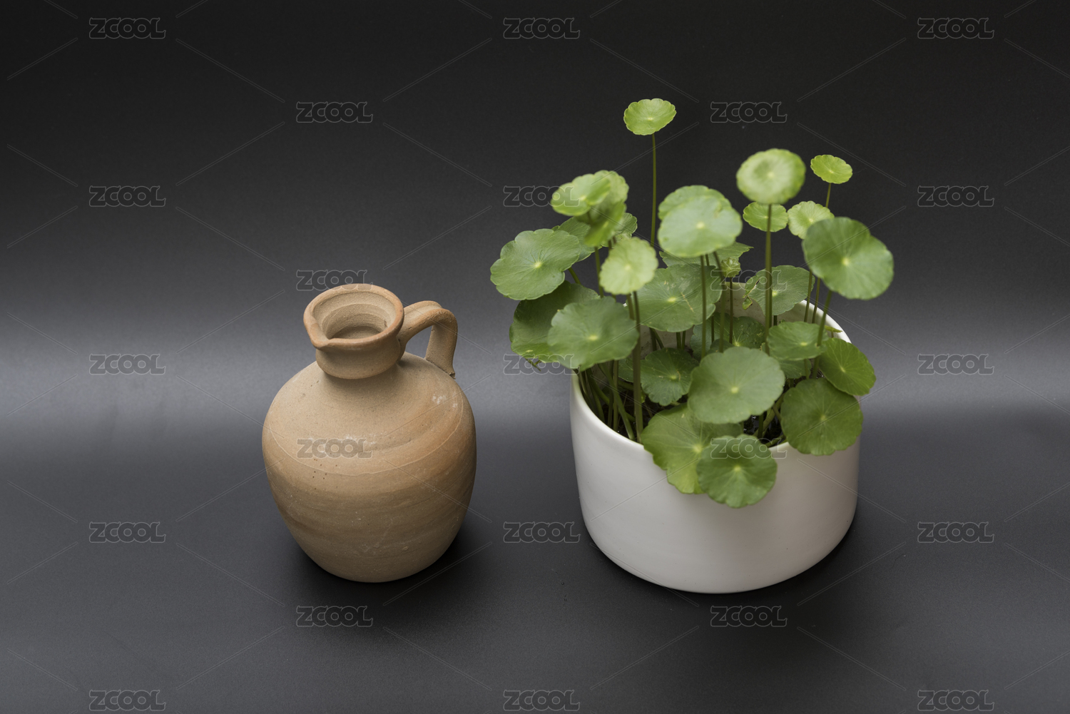 深灰色背景中的手工陶罐和白色瓷盘中的绿色金钱草