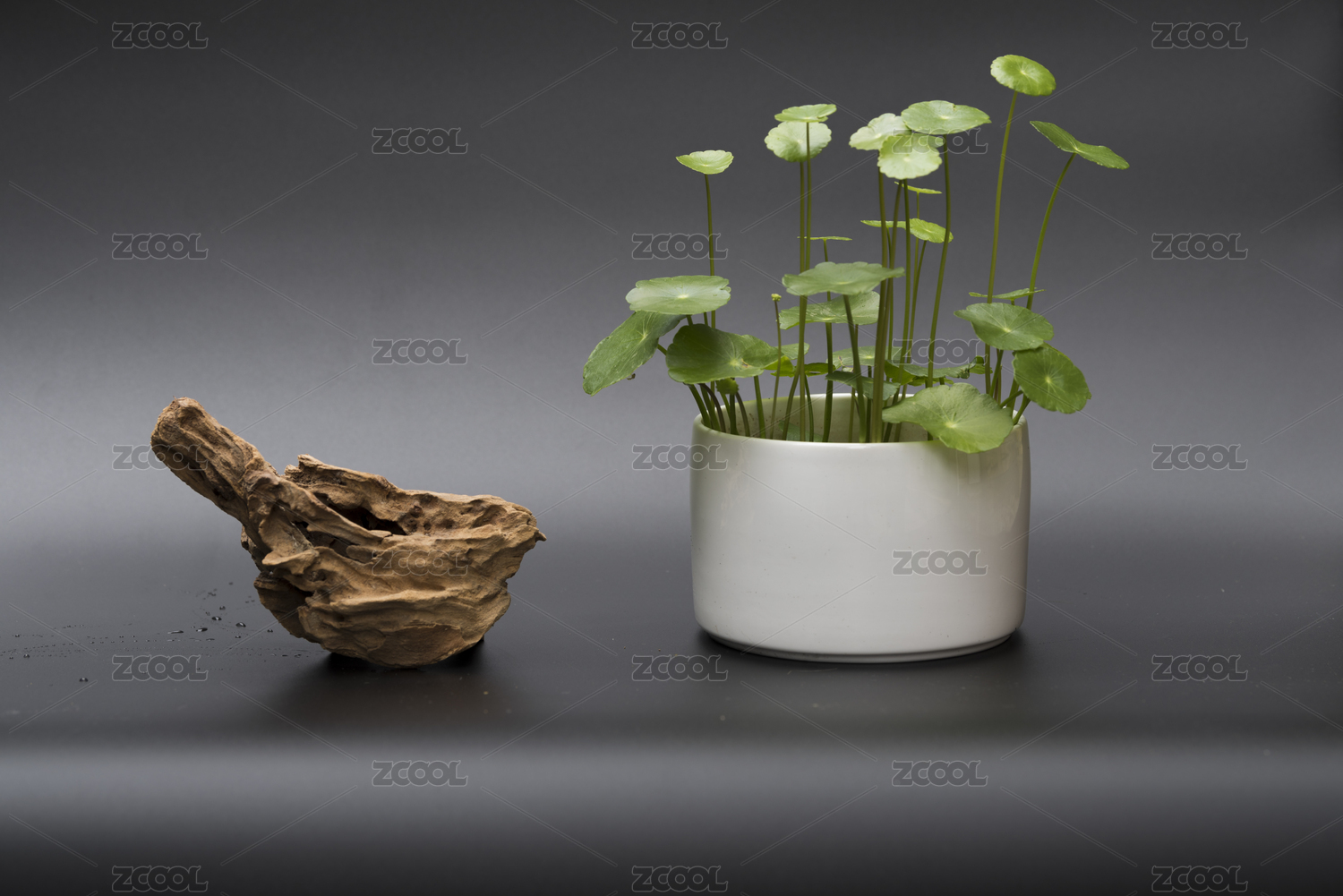 深灰色背景中的根雕的抽象小鸟和白色瓷盘中的绿色金钱草