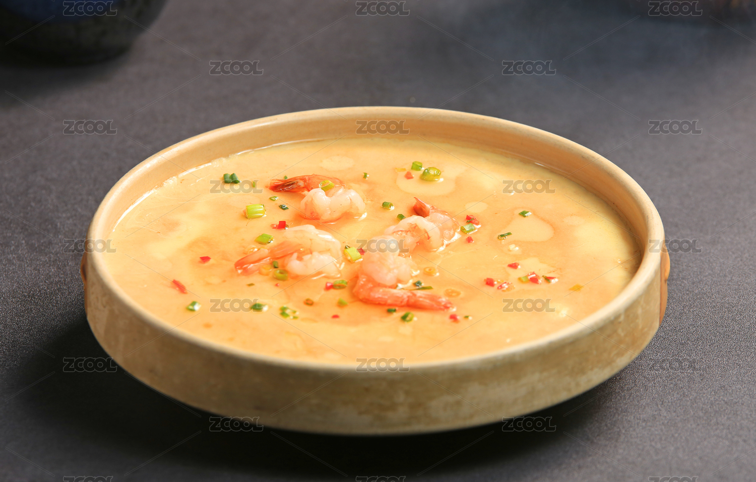 深灰色背景上一只浅黄色陶盘里的虾仁蒸鸡蛋