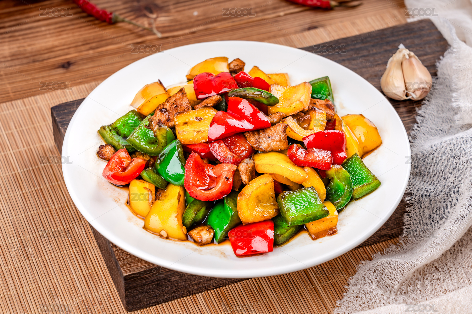 木板上放着一盘彩椒炒肉