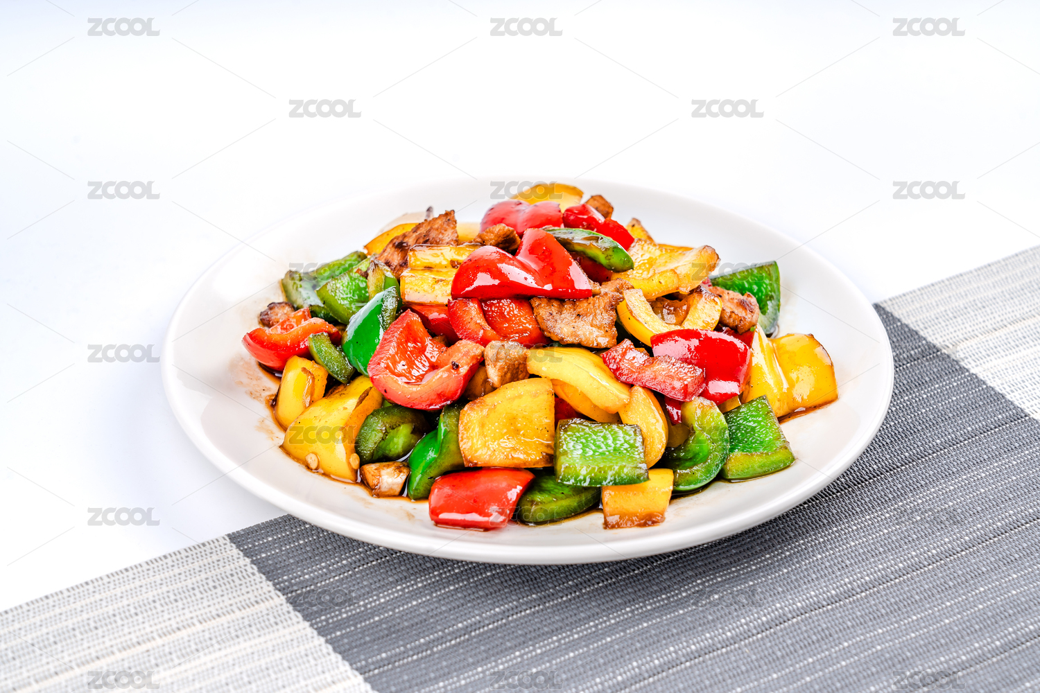 格子布上放着一盘五彩椒炒肉