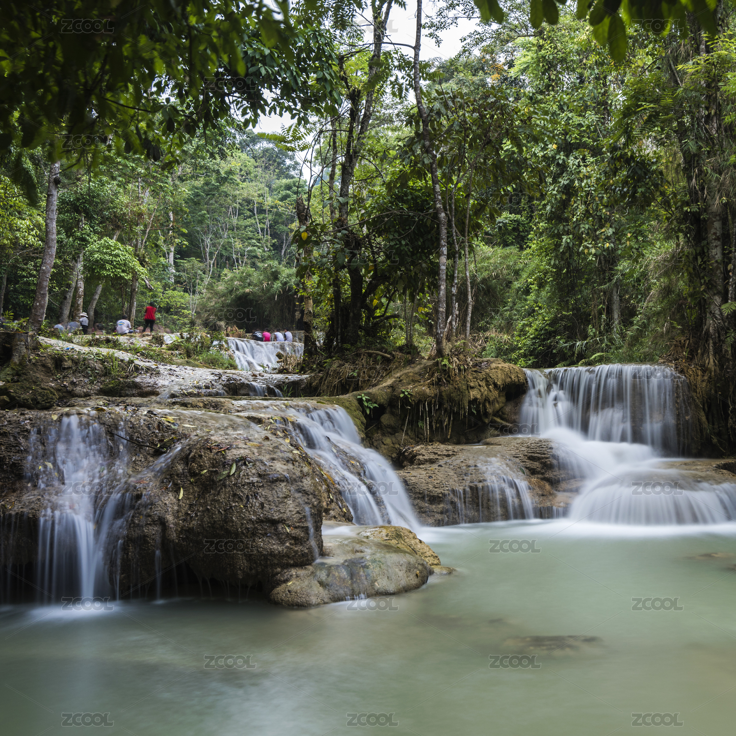 老挝琅勃拉邦著名旅游景点光西瀑布景区的溪流小瀑布群