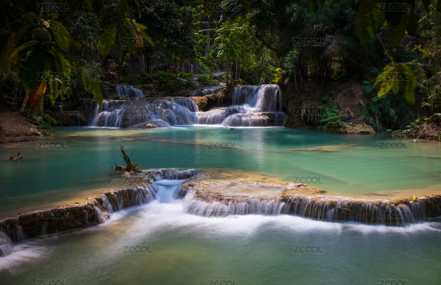 老挝琅勃拉邦著名旅游景点光西瀑布景区的溪流形成的叠溪水池