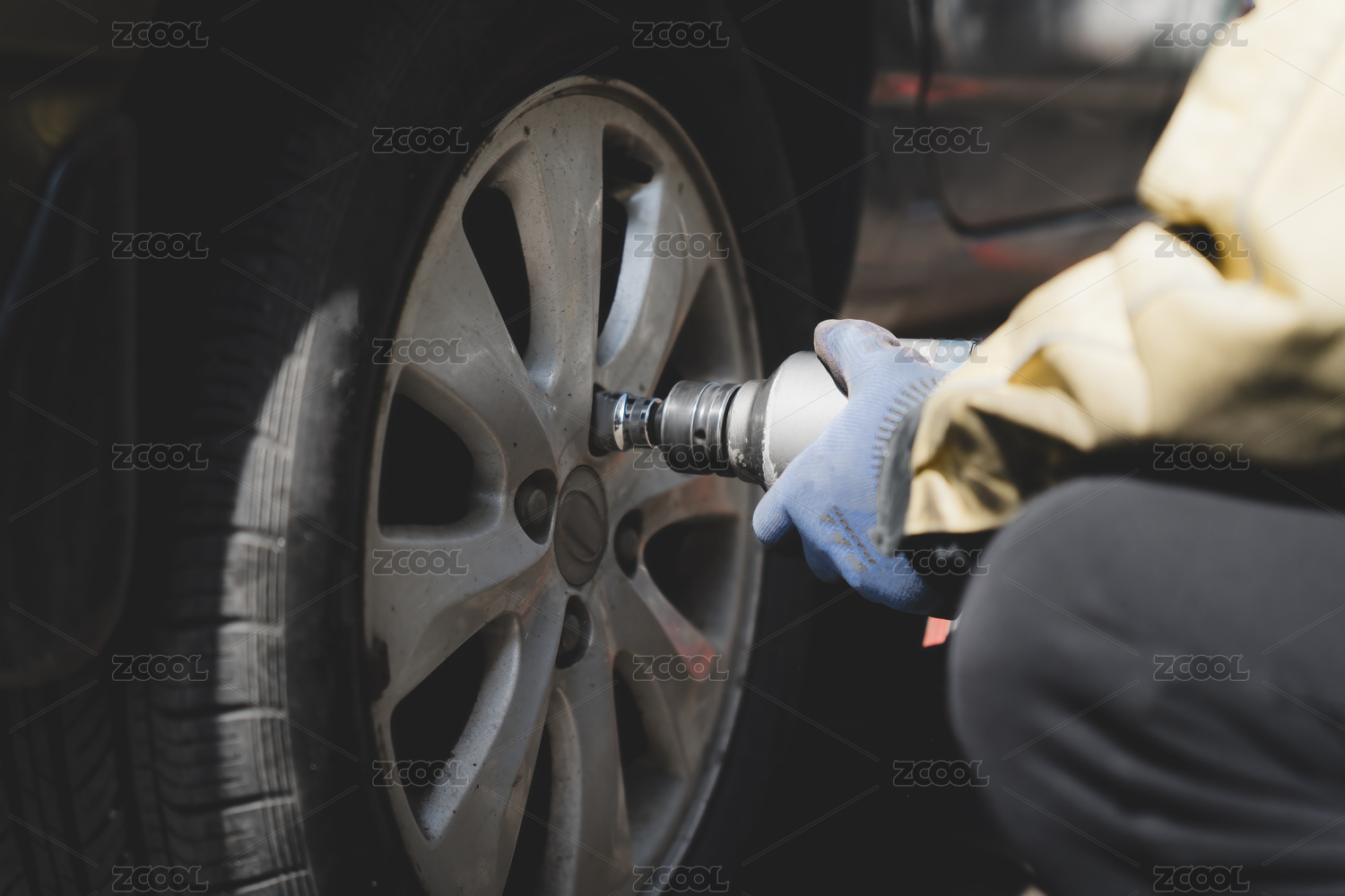 在汽车车间使用电动工具手动更换轮胎