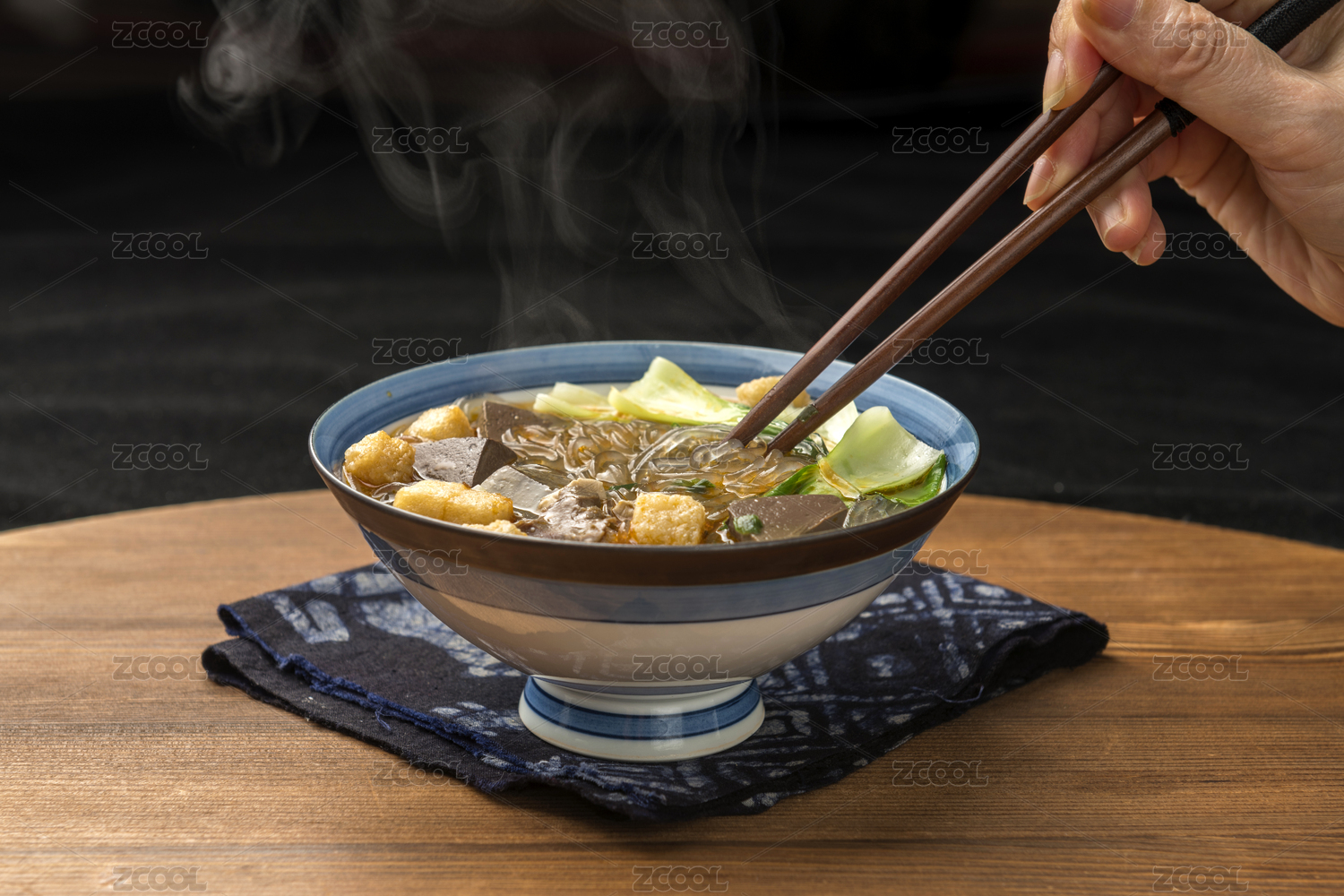 南京传统小吃鸭血粉丝汤摆放在木桌面上特写