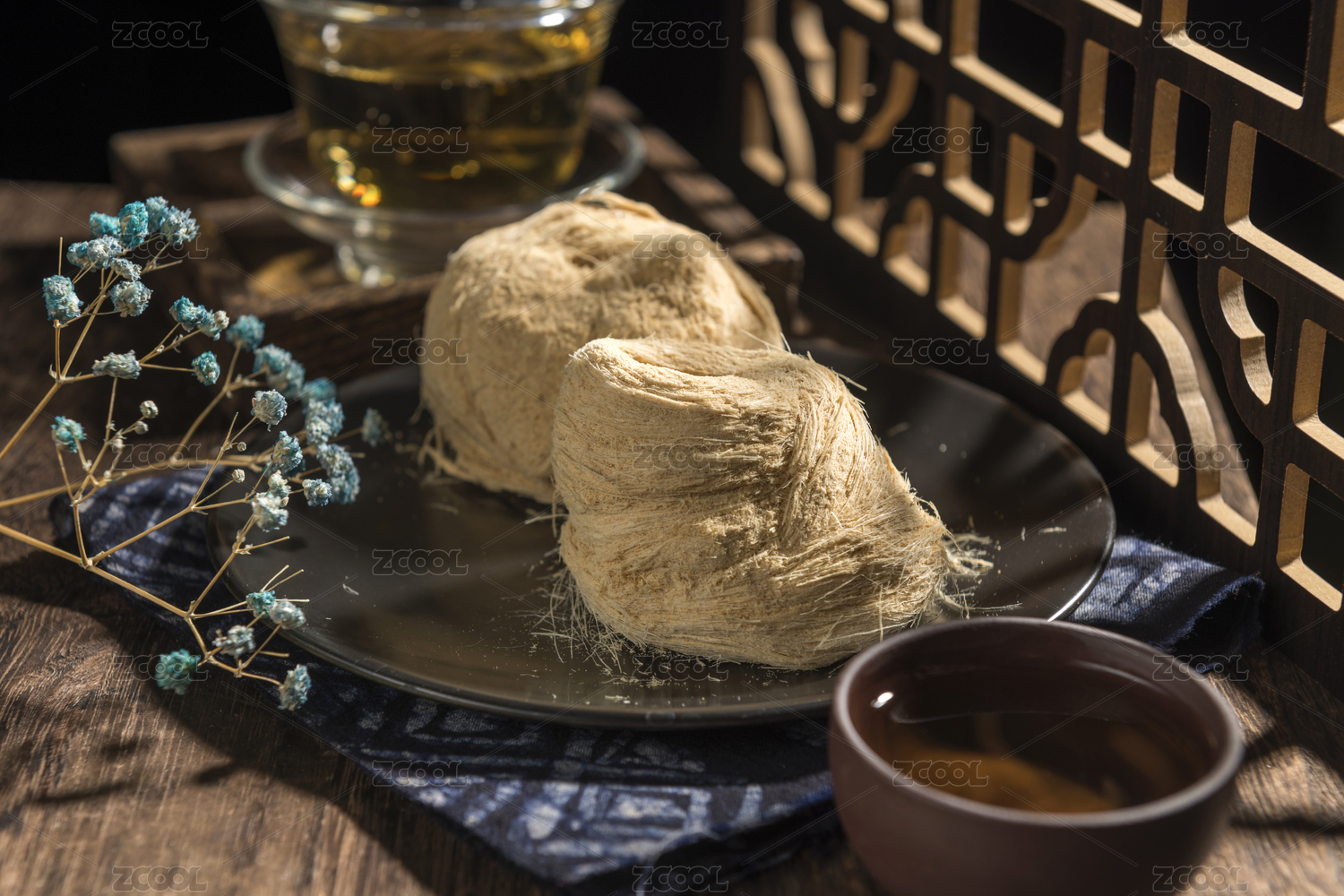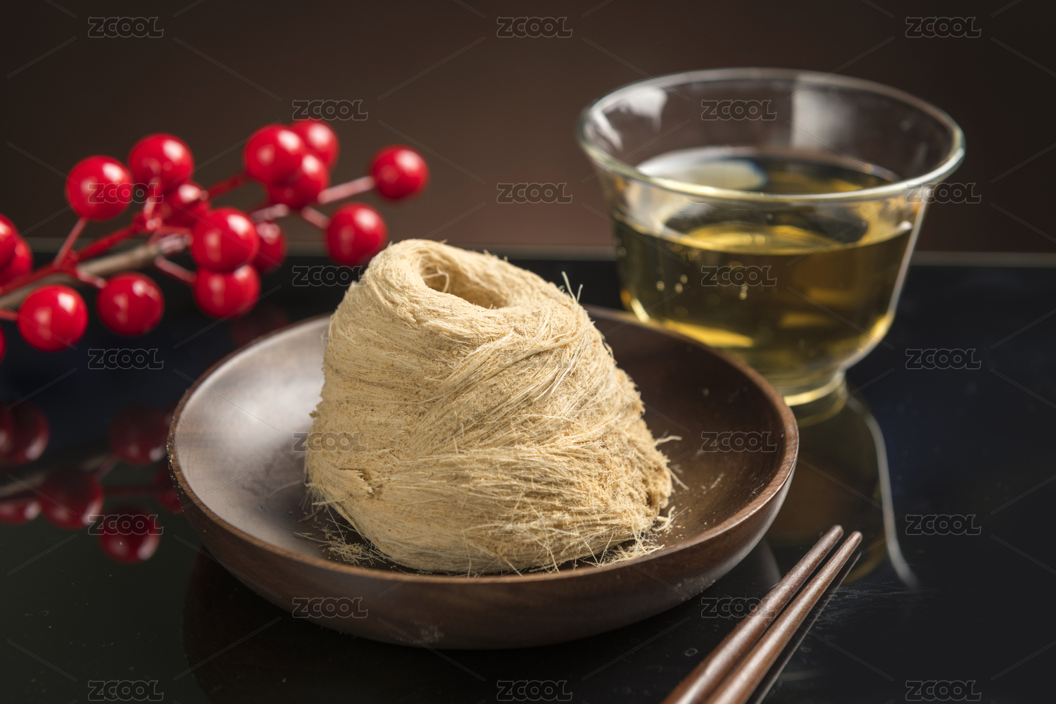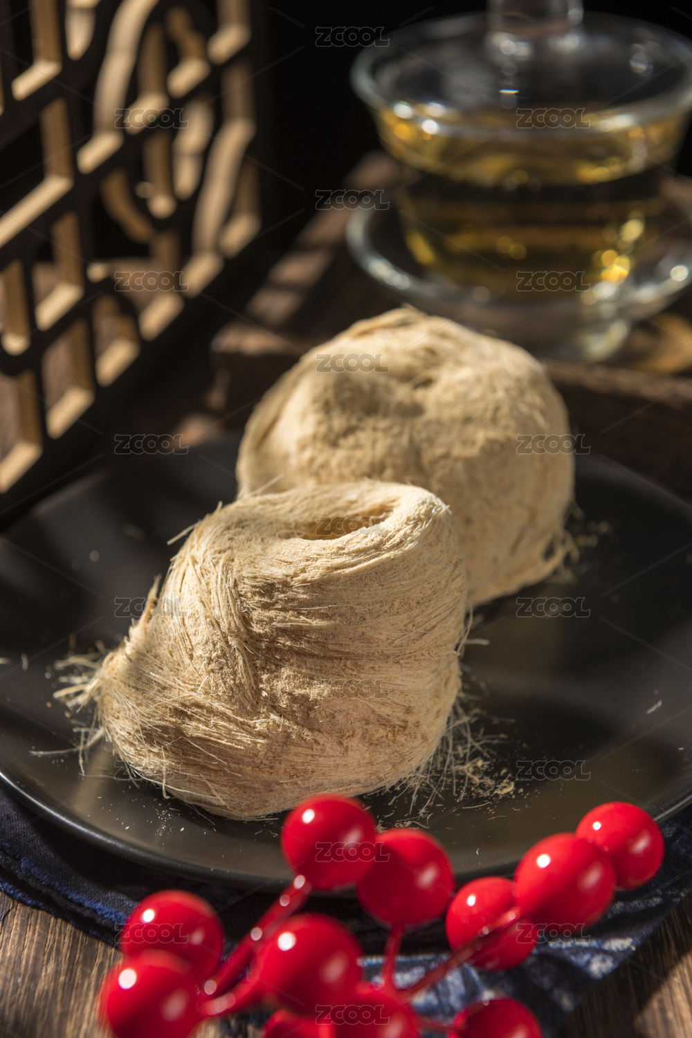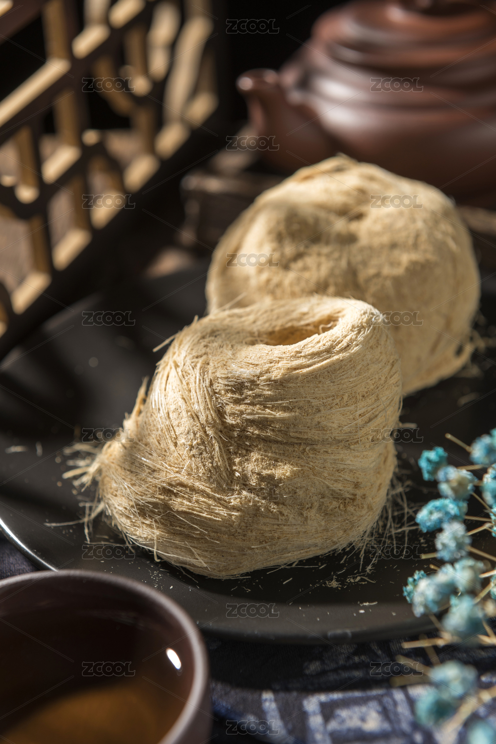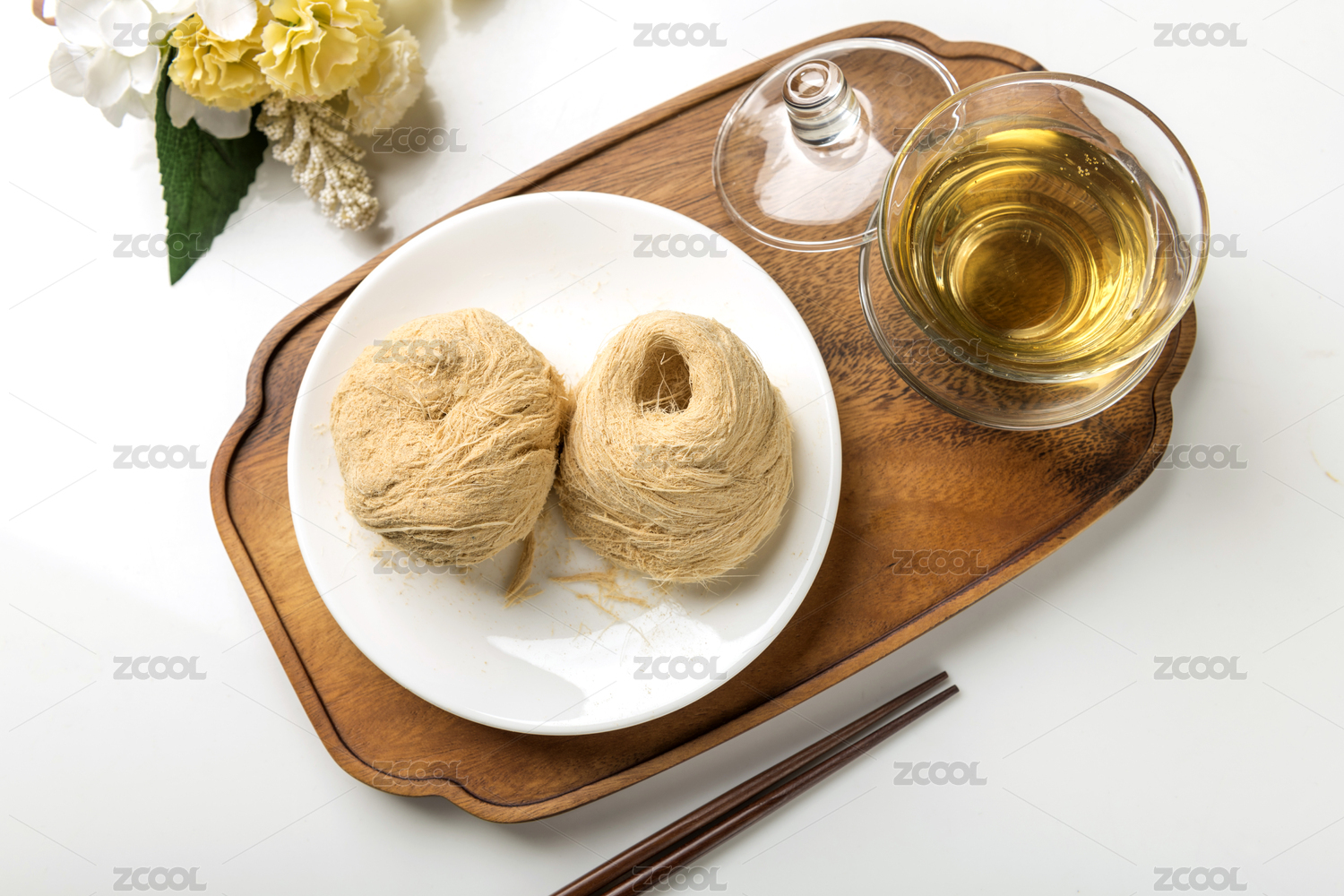 传统小吃龙须酥蟠桃酥摆放在桌面上特写