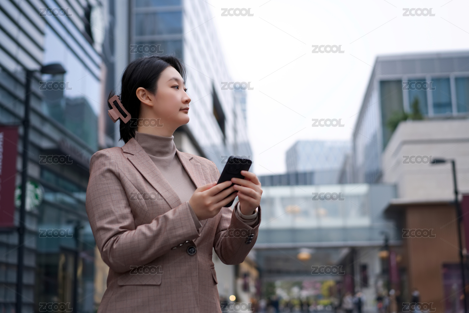 漂亮的诉权女人使用移动智能手机发短信与思考城市景观窗后台发送邮件站在室外人行道走廊。