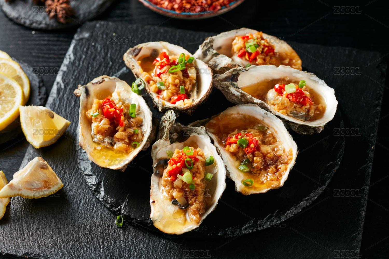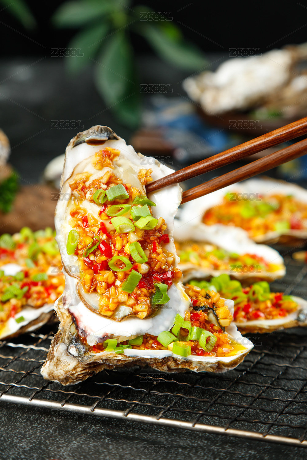 烧烤架上放着剁椒蒜蓉烤生蚝