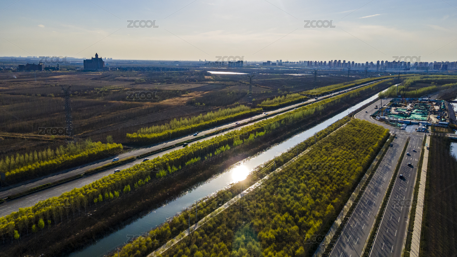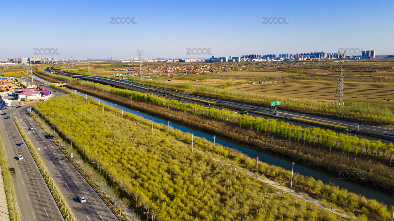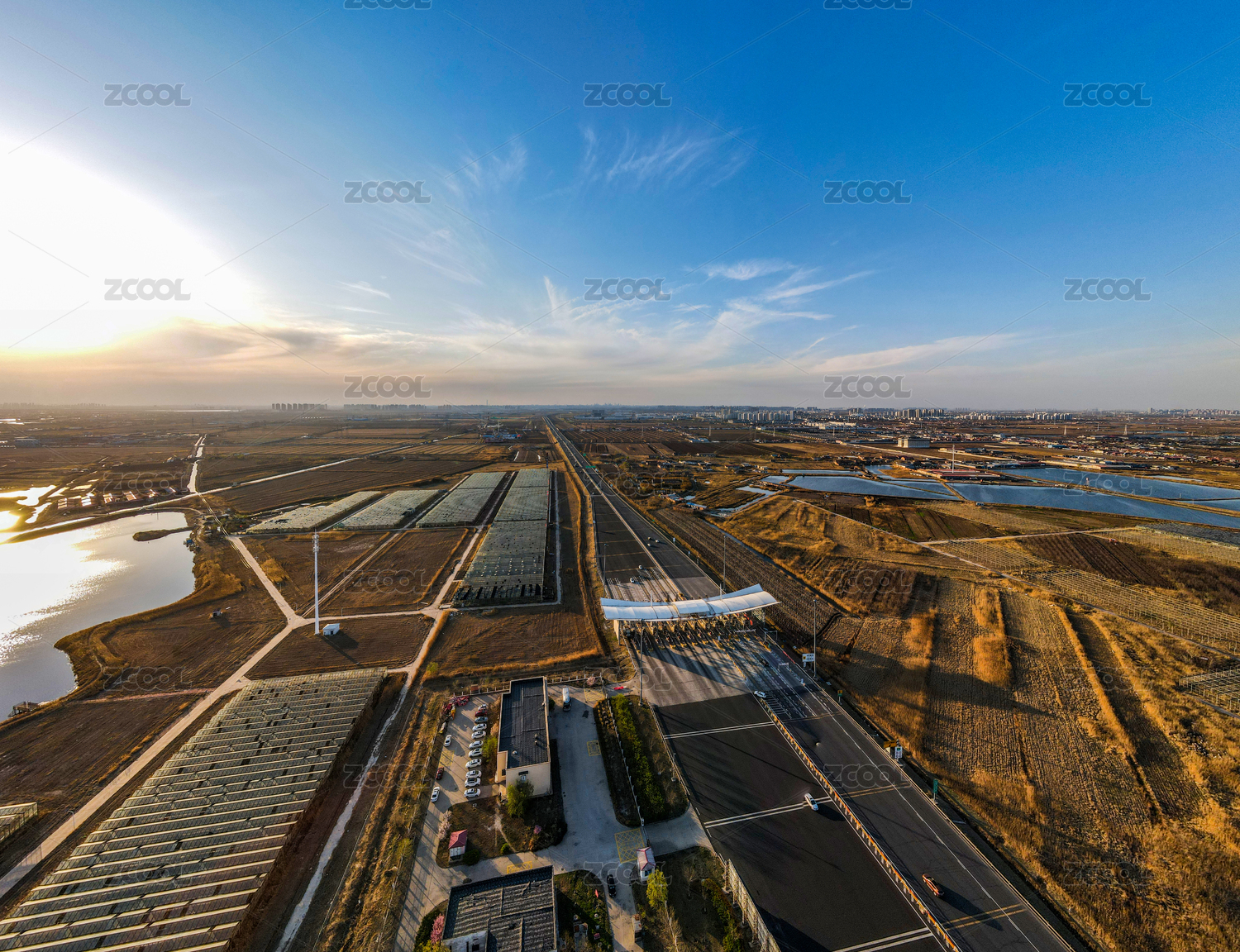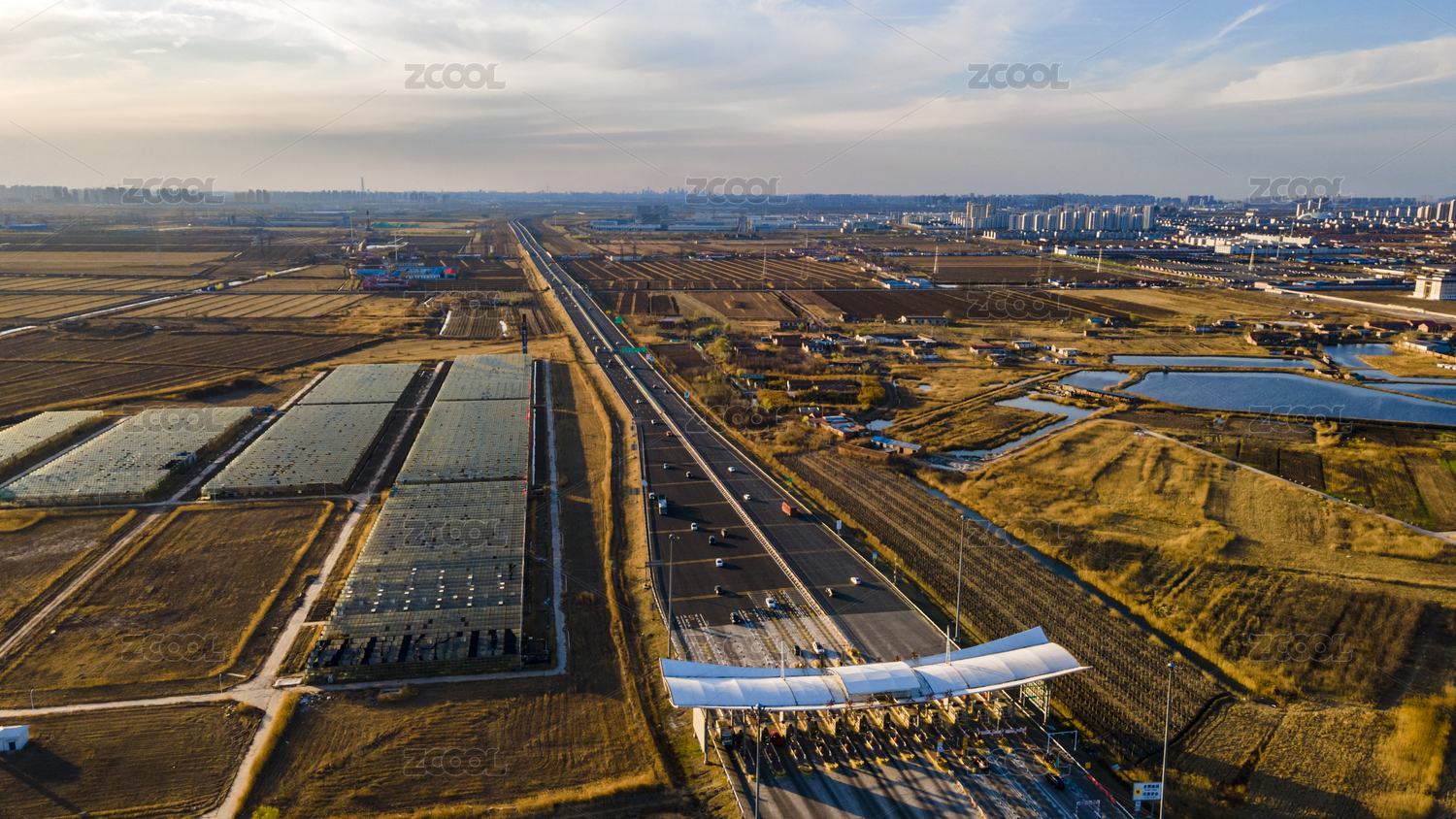 中国天津通往大港的津港高速大港收费站航拍俯视