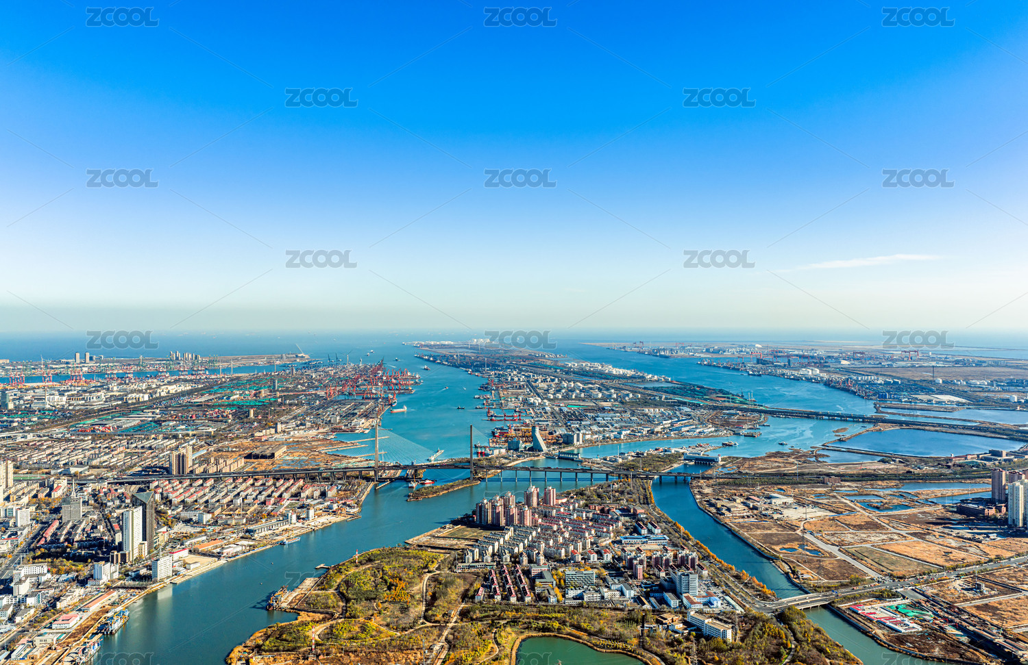 中国天津滨海新区海河大桥天津港航拍图