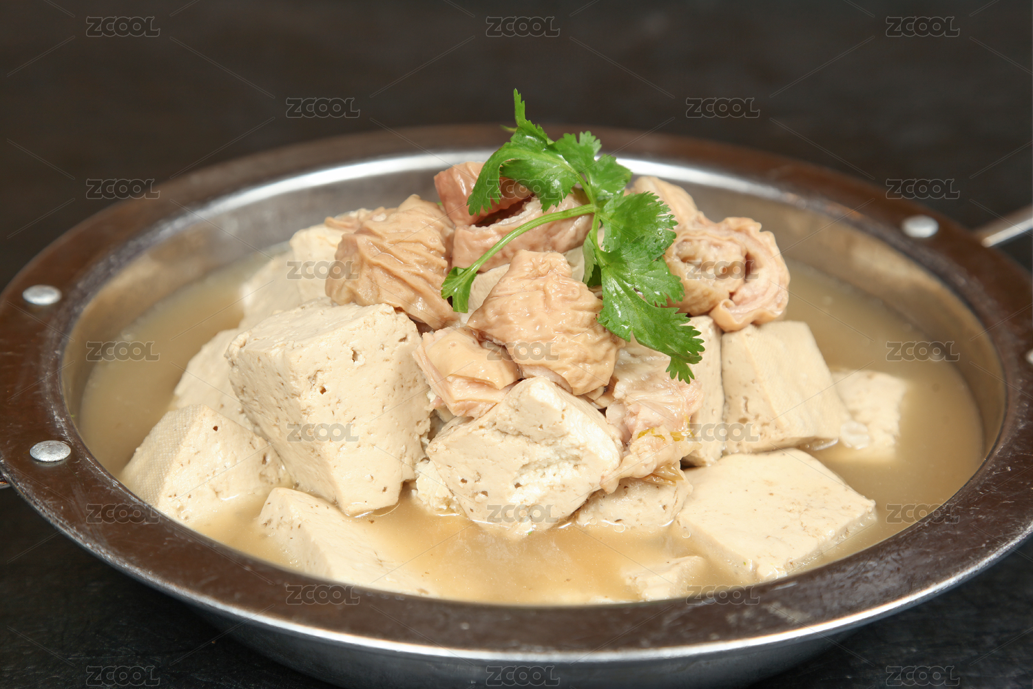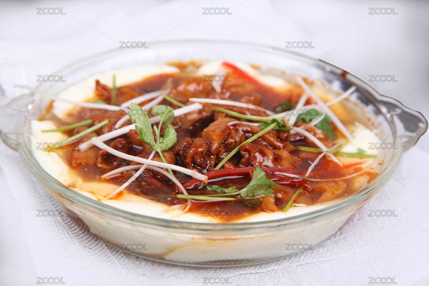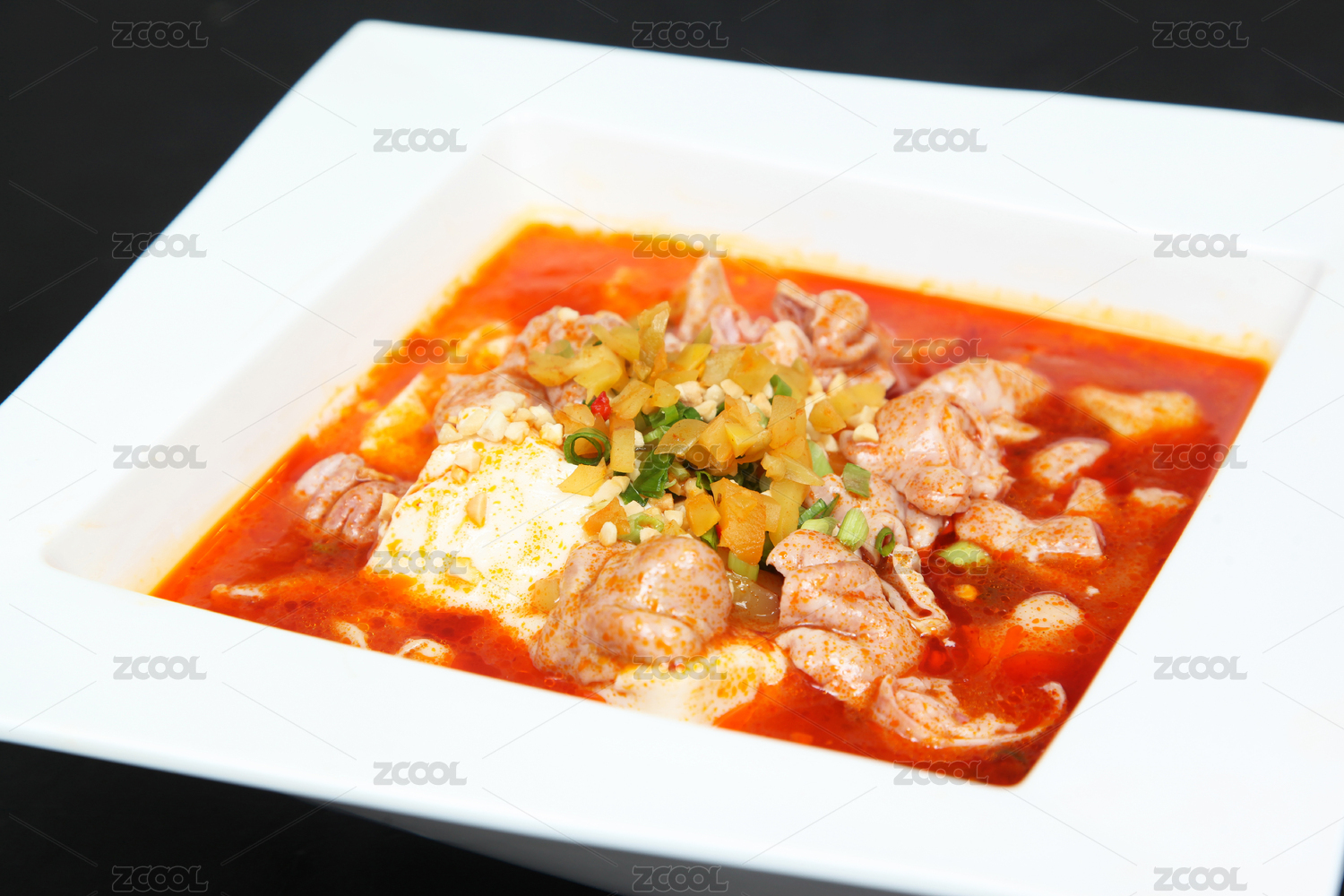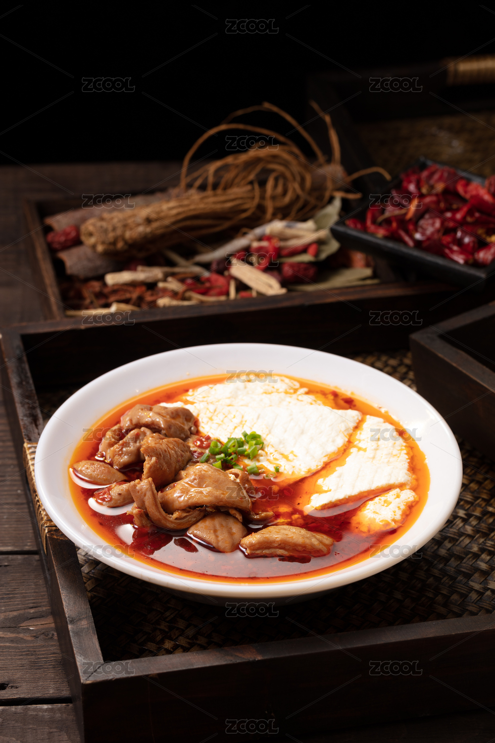 木盒上白碗里的红烧肥肠豆花