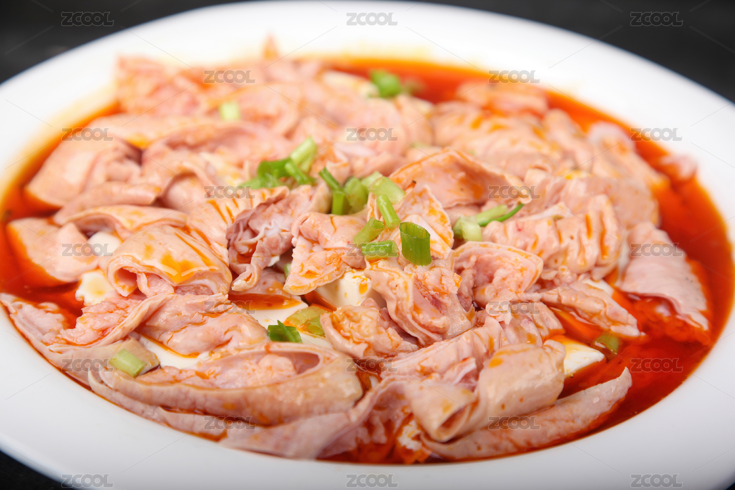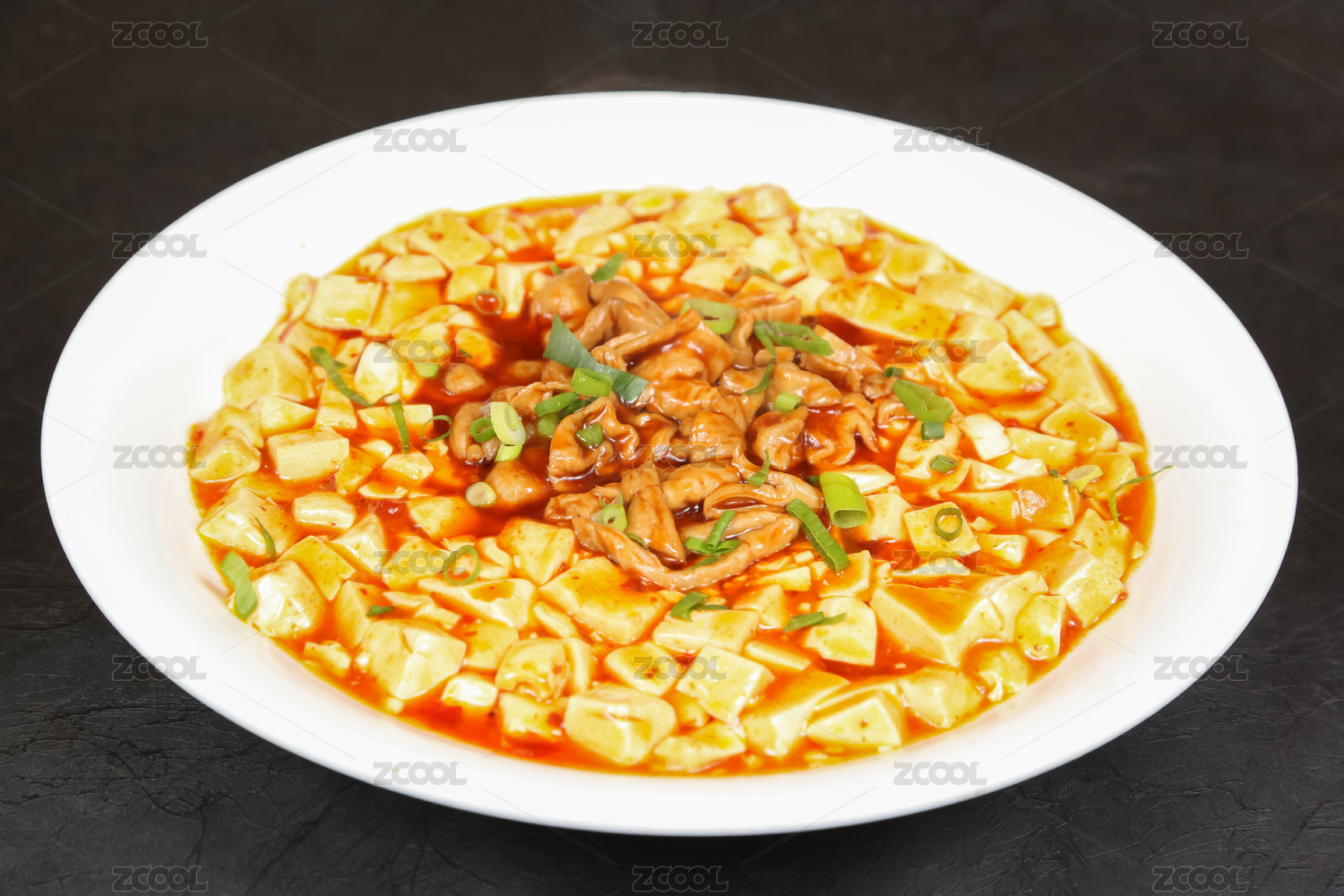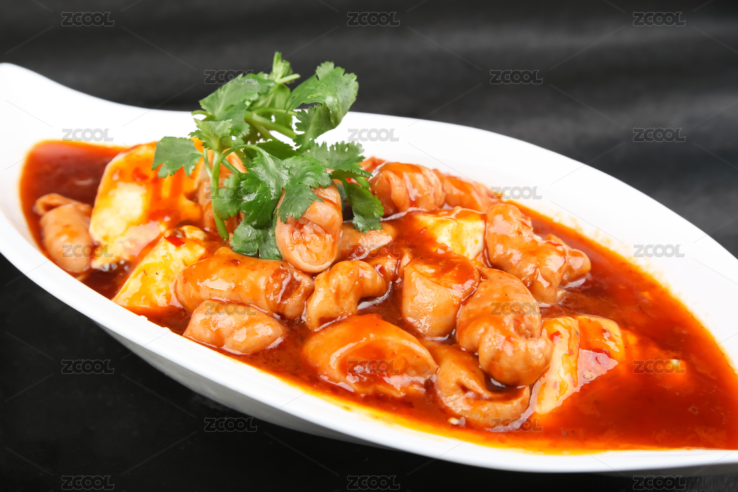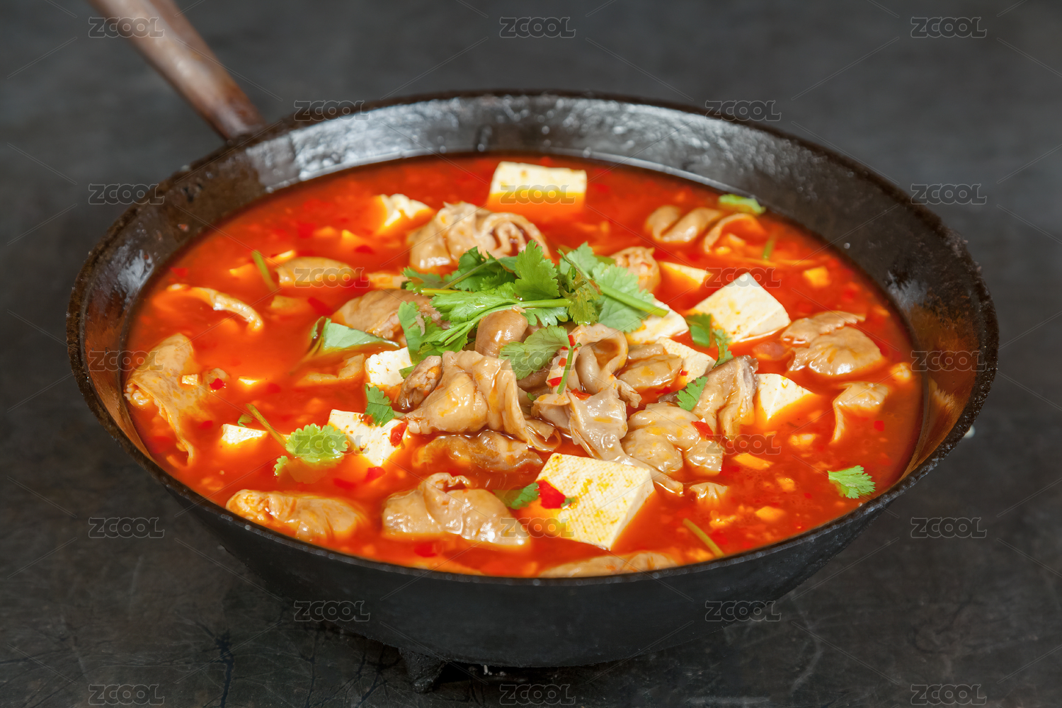 木盒上白碗里的红烧肥肠豆花