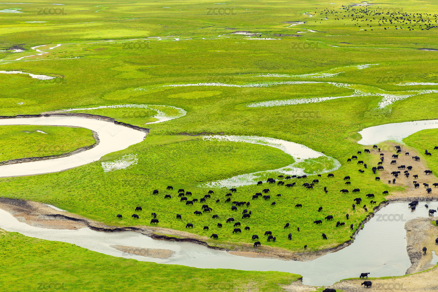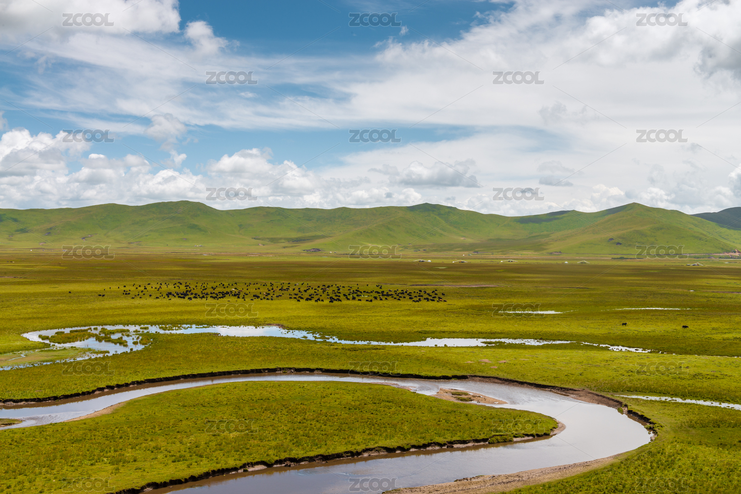 阿坝曼扎塘草原湿地蓝天牦牛草原