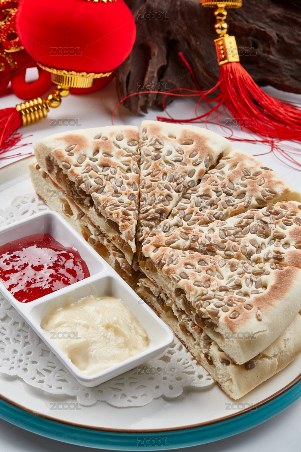 精美餐具装的葵花籽果干发面蒸饼