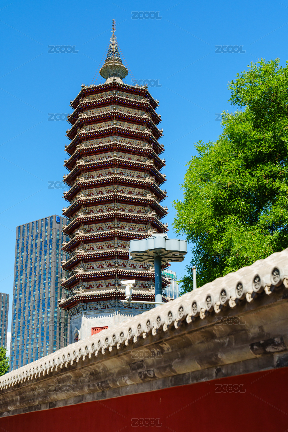 蓝天下的通州燃灯佛舍利塔与红墙灰瓦