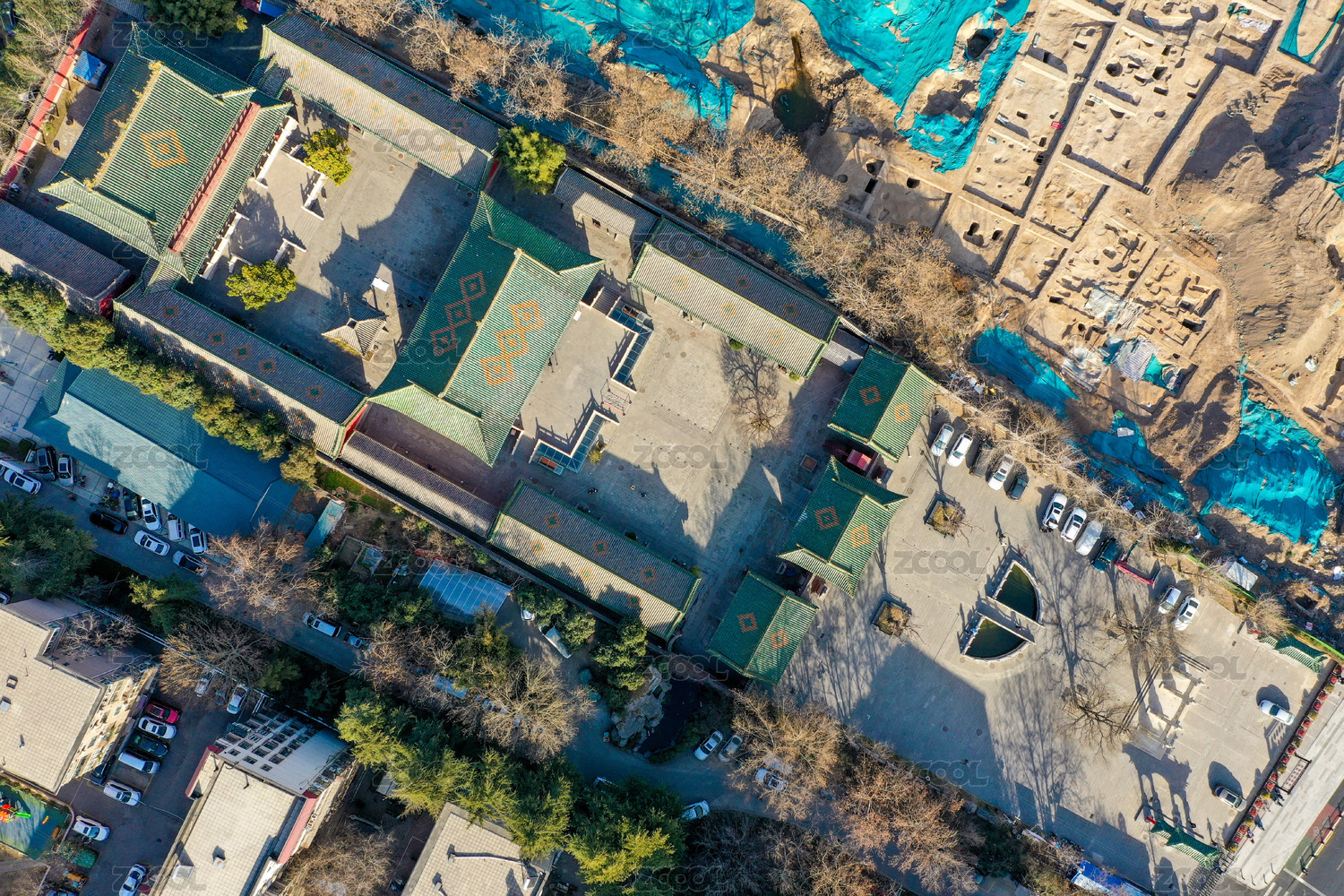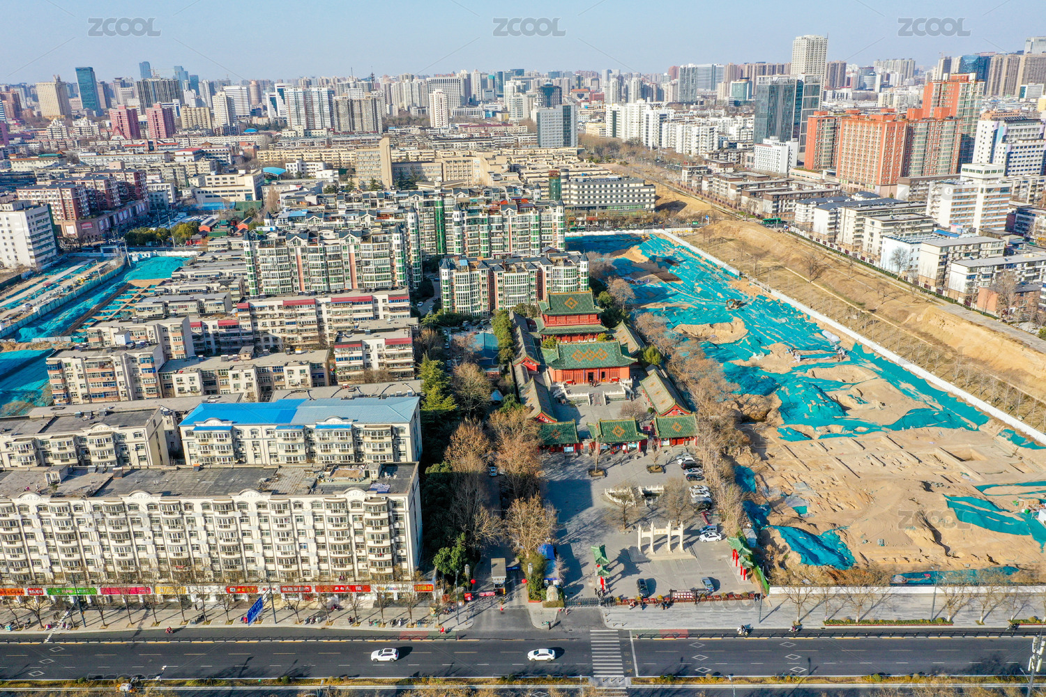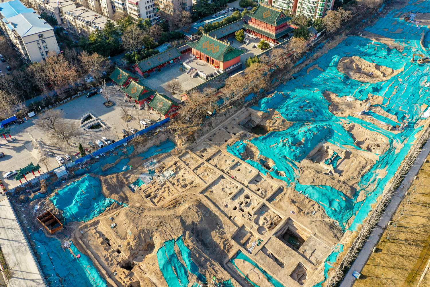 航拍中国郑州文庙及文物考古发掘工地探方