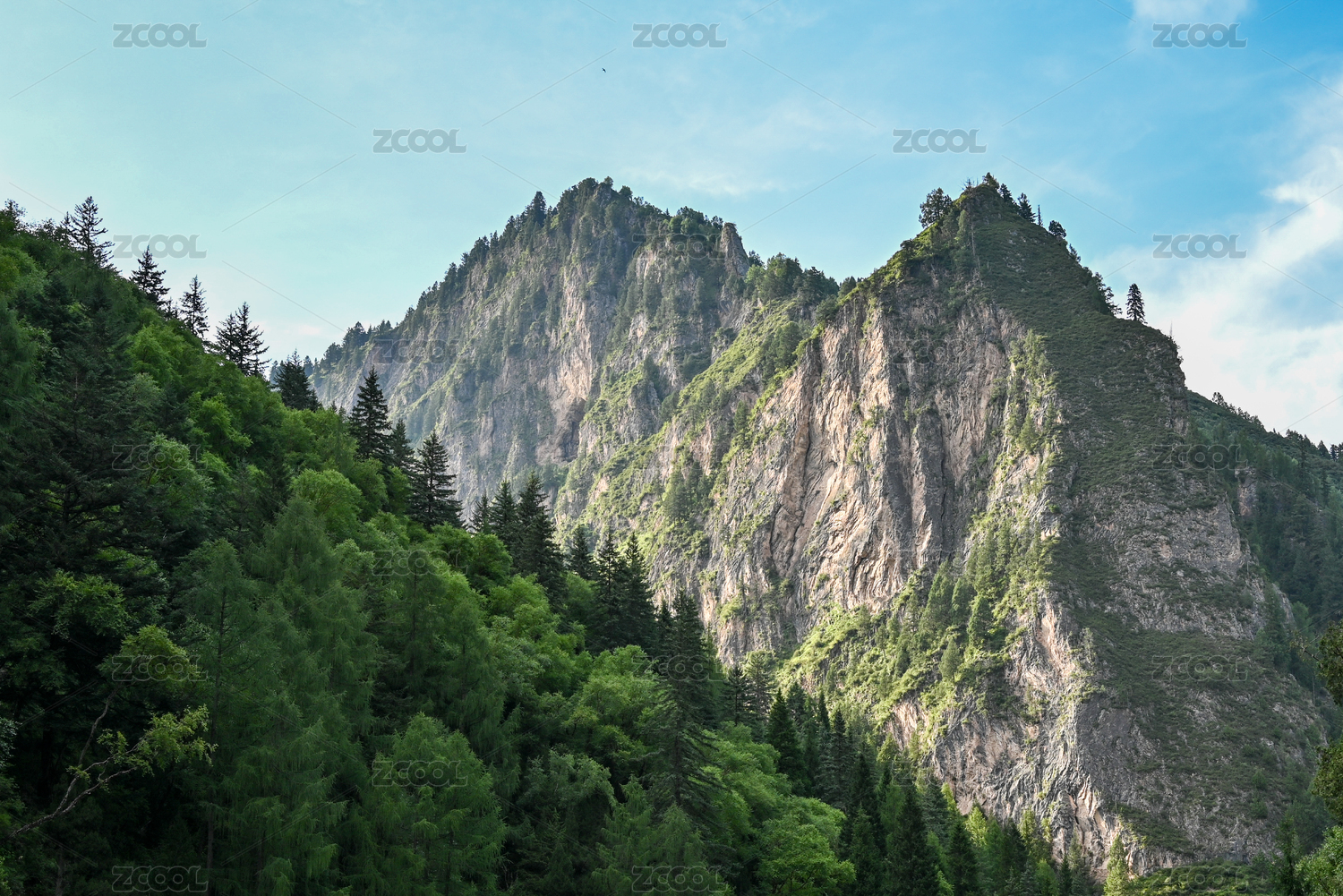 中国甘肃卓尼县大峪沟森林中矗立的三角山峰